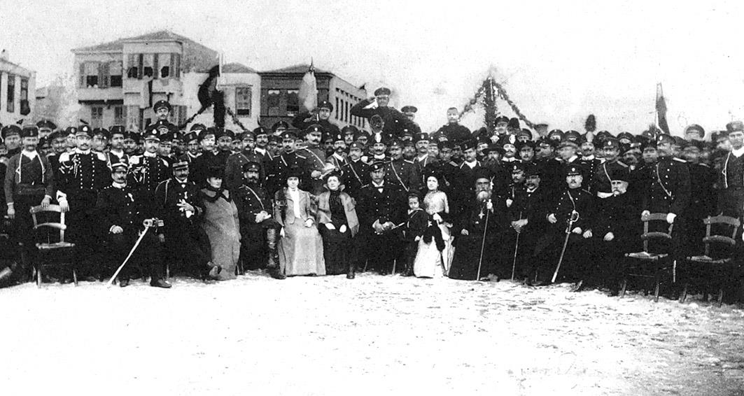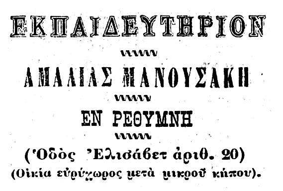 Η Αμαλία Μανουσάκη, διευθύντρια του νηπιαγωγείου Ρεθύμνης, φωτογραφίζεται καθισμένη τιμητικά δίπλα στον Πρίγκιπα Γεώργιο κατά την επίσκεψή του στο Ρέθυμνο το έτος 1899. Το νηπιαγωγείο της τελούσε υπό την προστασία της βασίλισσας των Ελλήνων Όλγας και χρηματοδοτούνταν από τις Ρωσικές αρχές Κατοχής.