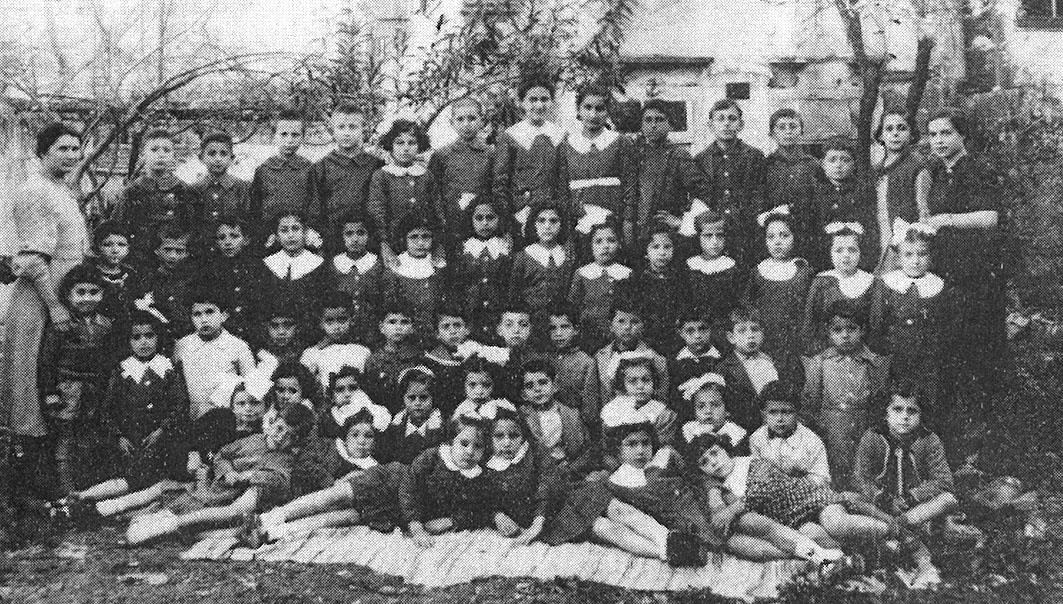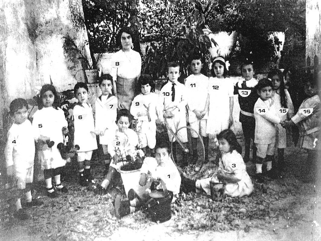 Φωτογραφία των νηπίων του Σχολείου το έτος 1911. Κρατούν τα λεγόμενα «φρεβελιανά δώρα». Τρίτος από αριστερά διακρίνεται ο Παντελής Πρεβελάκης, δίπλα στον μεγαλύτερο αδελφό του Νίκο, που τον κρατάει προστατευτικά από τα χέρια.