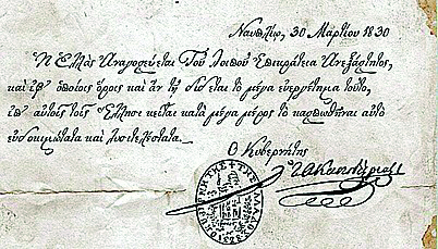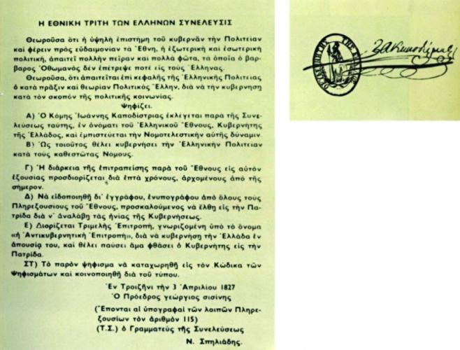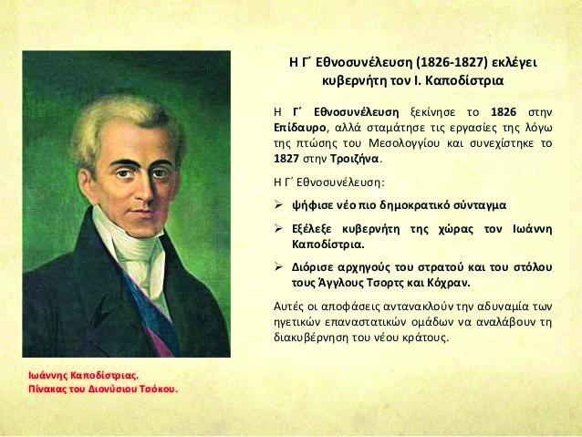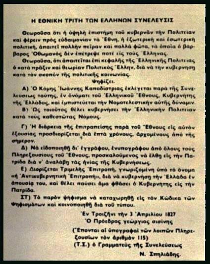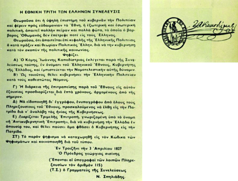 «η Συνέλευσις (Γ΄ Εθνική Συνέλευση των Ελλήνων στην Τροιζήνα, Μάρτιος 1827) ανηγόρευσε Κυβερνήτην επί κεφαλής της Ελληνικής Πολιτείας ένα και μόνον, τον κόμητα Ι. Καποδίστριαν, άνδρα πολιτικόν κατά τε την πράξιν και θεωρίαν, εις του οποίου τα προτερήματα εμπορεί δικαίως να καυχηθή η Ελλάς και από τον οποίον εμπορεί να ελπίση θαρρούντως (με θάρρος) την σωτηρίαν και ευδαιμονίαν (ευτυχία) της». 4(Διακήρυξη του προέδρου της Γ΄ Εθνικής Συνελεύσεως Γ. Σισίνη προς τον ελληνικό λαό, 4 Απριλίου 1827).