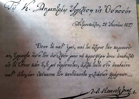 Παρακάτω παραθέτουμε μία επιστολή που του έστειλε ο αγωνιστής του γένους Πετρόμπεης Μαυρομιλάλης (τότε πρόεδρος του Εκτελεστικού).