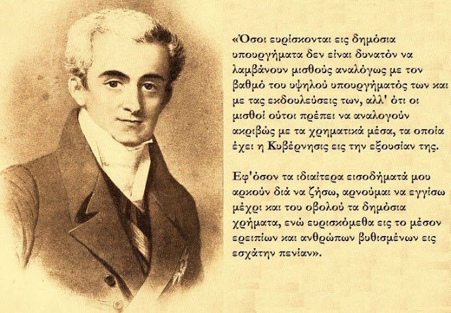 Τα ελαττώματα της εξωλεστάτης (ηθικώς διεφθαρμένης) τυραννίας βασιλεύουν εις τας παρούσας γενεάς, η δε αμάθεια και πλεονεξία επαπειλούν την αρτισύστατον (αυτήν που πρόσφατα δημιουργήθηκε) ανεξαρτησίαν του Έθνους σου. Έχομεν αξίους πολεμικούς αλλ’ υστερούμεθα εναρέτων ανδρώνκαι αναλόγως αξίων με τας περιστάσεις μαςδιότι η επιστήμη της πολιτικής είναι δυσκολώτατον μάθημα. … Έχομεν όπλα, έχομεν χρήματα, έχομεν αρκετούς πόρους και τρόπους, δια να νικήσωμεν τον βάρβαρον και ν’ ασφαλίσωμεν τα Ελληνικά δίκαια. Αλλ’ η αμάθεια και πλεονεξία επέφερε γενικήν αδράνειαν, ανυπέρβλητον αχρηματίαν. Εις έτι (ακόμη και τώρα) δεν εφάνη άνθρωπος μεγαλοφυής εις την Ελλάδα. Όλοι αισθάνονται τα δεινά, όλοι ταλανίζουν την πατρίδα, ουδείς ο επιφέρων την θεραπείαν.