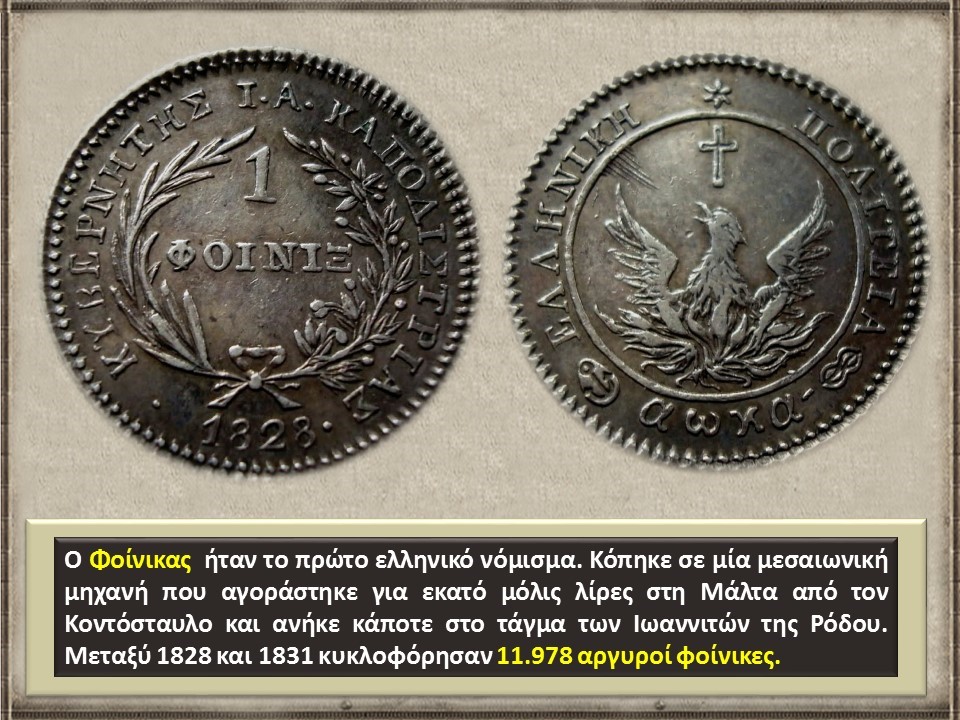 Με το Ζ' Ψήφισμα της 2ας Φεβρουαρίου 1828 δημιουργήθηκε η Εθνική-Χρηματιστική Τράπεζα. Στο ιδρυθέν στην Αίγινα Εθνικό Νομισματοκοπείο κόπηκε το πρώτο Ελληνικό νόμισμα, «ο Φοίνιξ», το οποίο αντικατέστησε το τουρκικό γρόσι.17