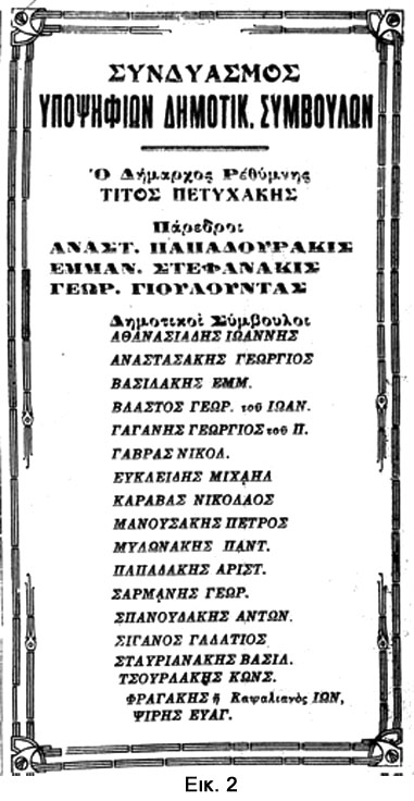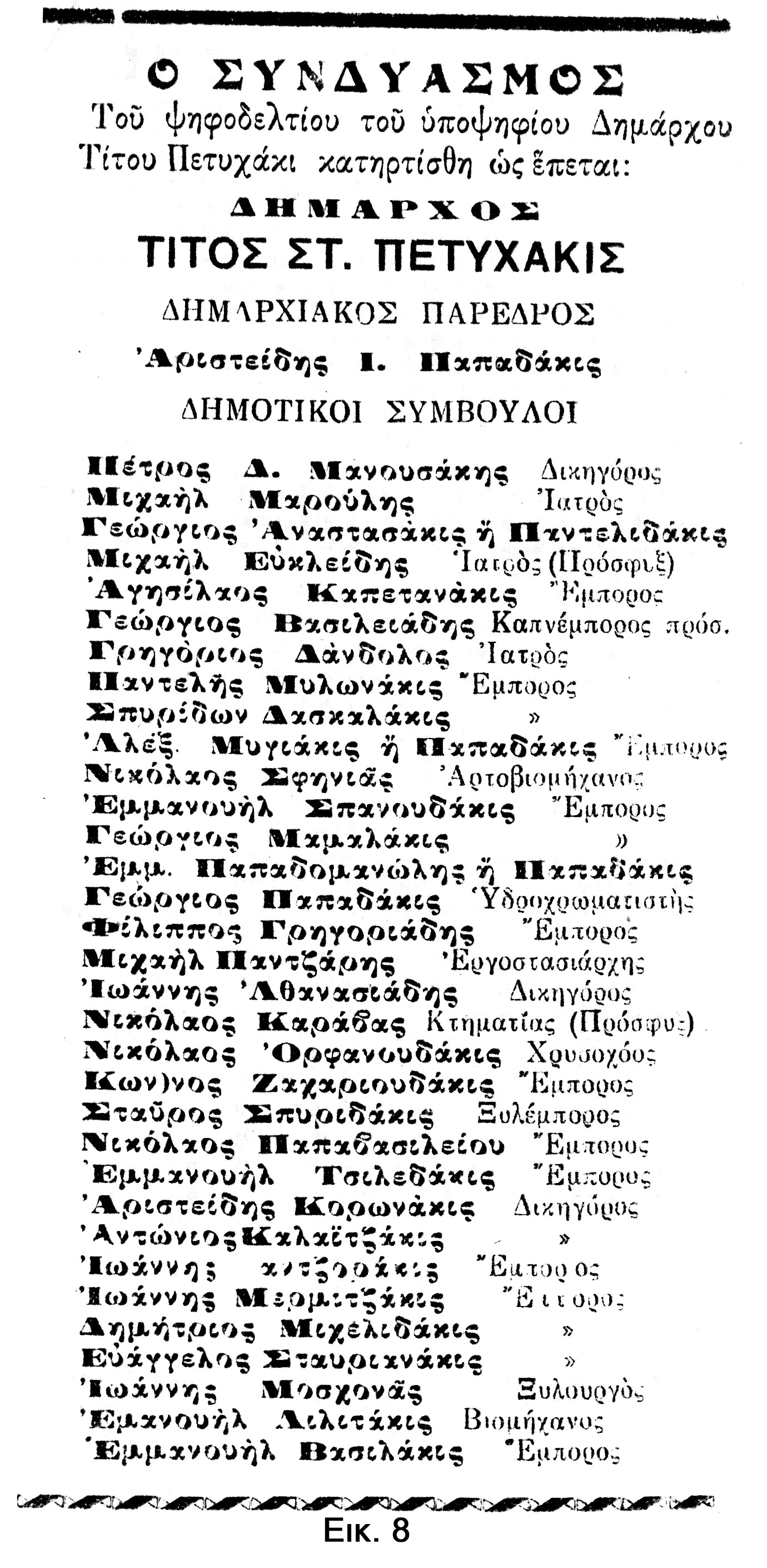 Εκτός από τον Τίτο Πετυχάκη που εξελέγη δήμαρχος ως μοναδικός υποψήφιος, εξελέγη, επίσης χωρίς αντίπαλο, δημαρχιακός πάρεδρος ο Αριστείδης Ι. Παπαδάκης, έμπορος (Εικ. 11).