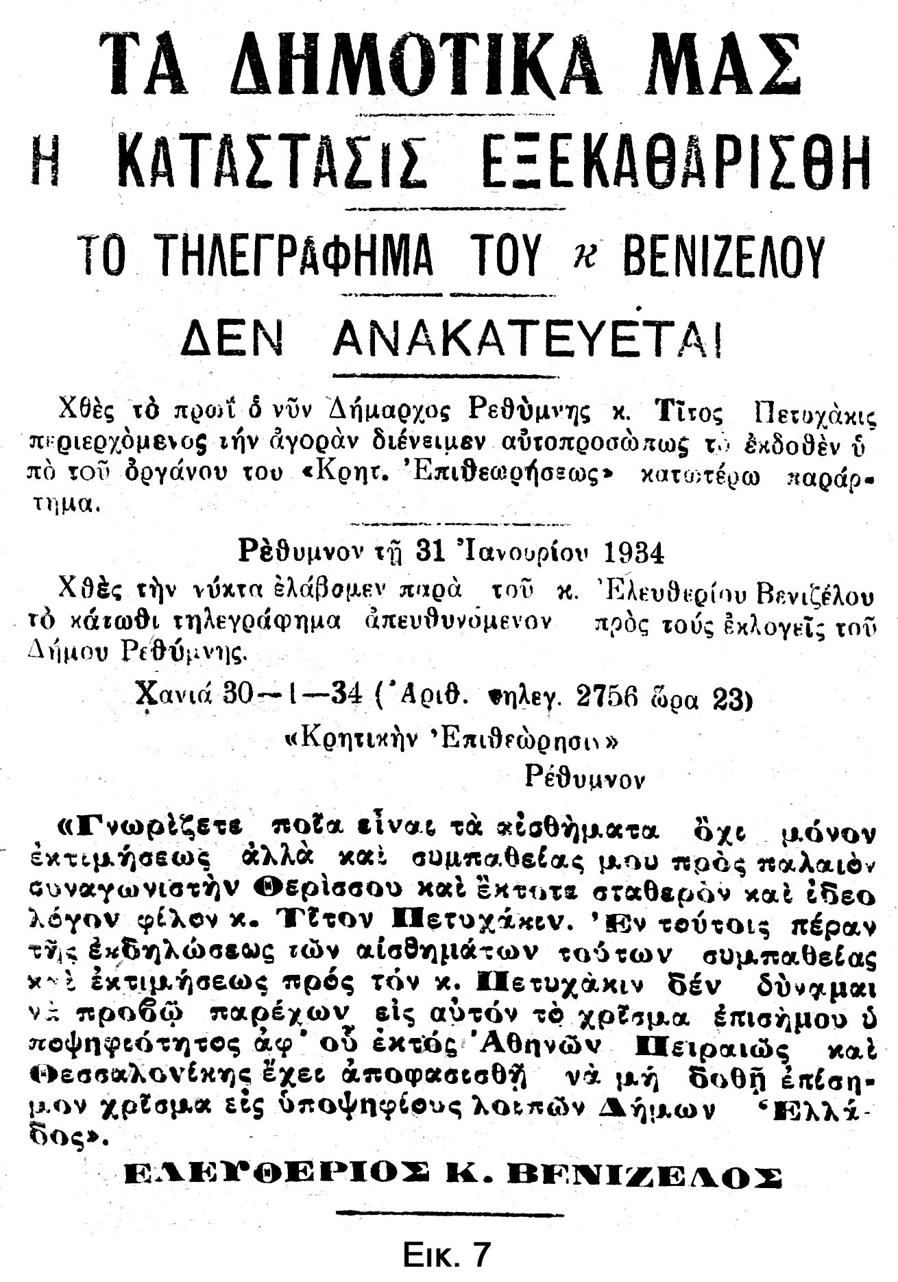 Ενώ στις προηγούμενες δημοτικές εκλογές είχε επικρατήσει στο Ρέθυμνο ένα κλίμα ηρεμίας πρωτόγνωρο για τα ελληνικά πολιτικά πράγματα. Το γεγονός ότι υπήρχε μόνο ένας υποψήφιος δήμαρχος απέτρεψε τις αντιπαραθέσεις και τη δημιουργία κλίματος έντασης. Αντίθετα στις εκλογές της 11ης Φεβρουαρίου 1934 επικράτησε μεγάλη οξύτητα και κλίμα ακραίας πόλωσης μεταξύ των δύο εφημερίδων του Ρεθύμνου, της «Κρητικής Επιθεώρησης» της οικογένειας Καλαϊτζάκη και του «Τύπου» του Μάνου Τσάκωνα. Και οι δυο εφημερίδες ήταν βενιζελικές, αφού οι εκδότες τους είχαν στενές σχέσεις με τον ίδιο τον Ελευθέριο Βενιζέλο. Παρότι όμως ανήκαν στην ίδια παράταξη ο εκδότης του «Τύπου» Μάνος Τσάκωνας δεν μπορούσε να δεχτεί την επανάληψη του φαινομένου των εκλογών του 1929, δηλαδή του ενός μόνο υποψηφίου δημάρχου και μάλιστα του ίδιου, δηλαδή του Τίτου Πετυχάκη. Έτσι άρχισε μια μεγάλη προσπάθεια εύρεσης δευτέρου υποψηφίου, που θα αντιπαρατίθετο στον Τίτο Πετυχάκη. Η προσπάθεια ευδοκίμησε όταν πείσθηκε ο γιατρός Σταμάτης Ρολόγης να υποβάλει υποψηφιότητα για δήμαρχος. Τότε η αντιπαράθεση έγινε ακόμη οξύτερη και η προσπάθεια και των δύο επικεντρώθηκε στο να εξασφαλίσουν το χρίσμα από τον ίδιο τον Βενιζέλο. Έτσι ο Βενιζέλος, αναγκάστηκε να στείλει τηλεγράφημα στήριξης του Πετυχάκη, όμως ένα «εν τούτοις» που υπήρχε στο κείμενο του τηλεγραφήματος, επέτρεψε στον Τσάκωνα και στην εφημερίδα του να το ερμηνεύσουν ως δήλωση ίσων αποστάσεων (Εικ. 7). Κατά συνέπεια ο καυγάς μεταξύ των δύο εφημερίδων συνεχίστηκε αμείωτος μέχρι που τη λύση έδωσε η παραίτηση του Σταμάτη Ρολόγη, παραίτηση που είναι προφανές ότι υπεδείχθη άνωθεν (Βενιζέλος). Έτσι επανήλθε η ηρεμία και ο αγώνας περιορίστηκε στην ψηφοθηρία μεταξύ των υποψηφίων δημοτικών συμβούλων. Στις εκλογές, εκτός από το ψηφοδέλτιο του Τ. Πετυχάκη (Εικ.8), συμμετείχαν με δικό τους ψηφοδέλτιο και οι επαγγελματικές τάξεις με τους εκπροσώπους τους (Εικ. 9).