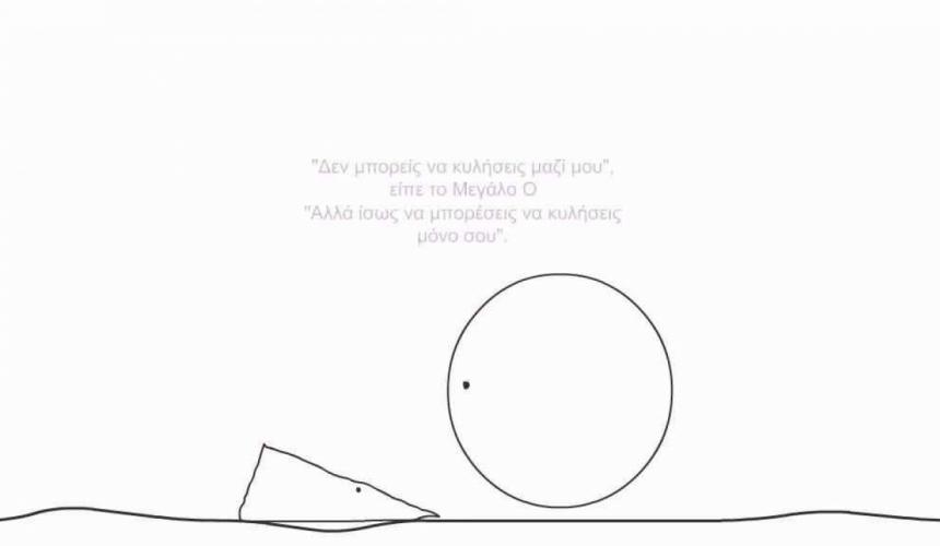 Μεσολαβεί σιωπή, απομόνωση και περισυλλογή ώσπου να φανεί το Μεγάλο και ολοστρόγγυλο Ο. Ο ιδιαίτερος αυτός χαρακτήρας, και εκ πρώτης όψεως περίεργος καθώς δεν ζητά τίποτα. Επιθυμεί απλά να κατευθύνει το τρίγωνο, να το βοηθήσει μέσα από τη συζήτηση να αντιληφθεί πως η ολοκλήρωση και ευτυχία είναι πρωτίστως προσωπική υπόθεση και δεν κρίνεται σε ανούσιες περιστασιακές επαφές. Η κοινωνική πίεση, βέβαια, για αποδοχή και συντροφικότητα αποσυντονίζει και δεν αφήνει πολλά περιθώρια για εμπιστοσύνη στον εαυτό και την εξέλιξή του. Συνήθως η διαπαιδαγώγηση περιλαμβάνει ιδέες περί «από μηχανής θεού» που θα έρθει ξαφνικά καλύπτοντας το οποιοδήποτε κενό και δίνοντας νόημα στην ζωή μας. Η πίστη σε αυτό κάνει τη μοναξιά βάναυση, δίχως καμία ιδέα για τα οφέλη της μοναχικότητας. Το Μεγάλο Ο όμως, σε ρόλο καθοδηγητή, τον προτρέπει να κυλήσει μόνο και προτάσσει πως η συνύπαρξη απαιτεί αυτάρκεις οντότητες. Γκρεμίζεται ο μύθος περί άλλου μισού κι αυτό διότι ο άνθρωπος δεν είναι μισό αλλά ολόκληρο. Δύο ολοκληρωμένες προσωπικότητες πορεύονται παρέα από επιλογή και με ελευθερία. Αντιθέτως, δύο μισά από συμφέρον για προσωπική ανέλιξη και σκοπό εκμετάλλευσης. Ωθεί λοιπόν στην αγάπη και το χτίσιμο του εαυτού. Στην μη προσμονή ευτυχίας ως διά μαγείας καθότι δεν θα ανοίξει κανείς ξαφνικά την πόρτα να μπει από τη στιγμή που το κλειδί το κρατάμε οι ίδιοι.