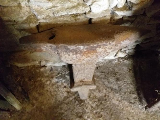 Η τροχαλία όμως έπρεπε να γυρίζει πάνω σε κουζινέτα. Πήγα στον Άϊ Γιάννη, στο Χαλκιά που λεγόταν Μανόλης, ήταν ζωηρός άντρας με μουστάκι αντρίστικο, νομίζω τον έλεγαν Φωτάκη, του είχαμε εμπιστοσύνη. Μου έφτιαξε δυο στρογγυλά σιδερένια καρφιά των 12 χιλιοστών. Του υπέδειξα ότι στα θηλυκά κουζινέτα απάνω, θα γύριζε η φτερωτή και θα έμπαιναν σε κάθε πάσαλο. Τα αρσενικά κουζινέτα έβαλε σε κάθε άκρη του άξονα. Οι πάσσαλοι ήταν χονδροί και μυτεροί για να καρφωθούν στο έδαφος. Πάνω σ’ αυτούς θα ζυγιαζόταν η φτερωτή, για να δουλεύει σωστά. ………………………………………………………………………………………………………..Όλοι μαζί από τη χαρά μας χοροπηδούσαμε και τραγουδούσαμε. Ο Νίκος Σουρής, έβγαλε και λόγο: Με αυτό το μηχάνημα πολεμούμε τους πανίσχυρους Γερμανούς με τα πολλά τανκς και τα στούκας. Αυτό είναι το μυστικό όπλο μας εναντίον τους.»