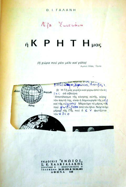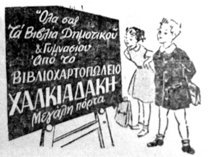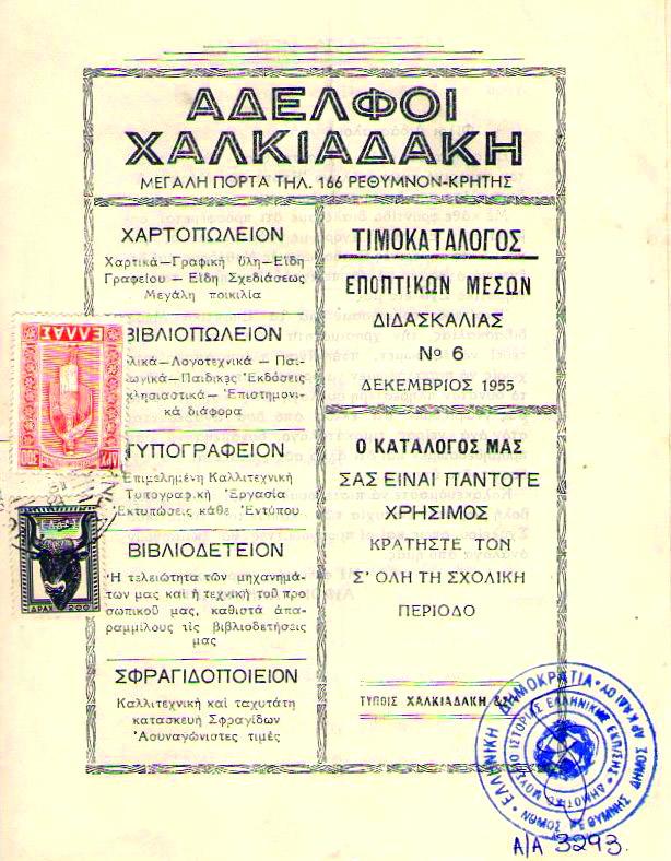 Όπως αναγράφεται στο εξώφυλλο, τα κατάστημα των αδελφών Στέλιου και Γιάννη Χαλκιαδάκη το έτος 1955 δεν ήταν απλά βιβλιοπωλείο (με βιβλία λογοτεχνικά, παιδαγωγικά, παιδικά, εκκλησιαστικά, επιστημονικά κ.ά.) αλλά επίσης χαρτοπωλείο, όπως επίσης και τυπογραφείο, βιβλιοδετείο και σφραγιδοποιείο. Να συμπληρώσουμε ότι αργότερα έφερε στο Ρέθυμνο και το πρώτο μηχάνημα φωτοτυπίας.