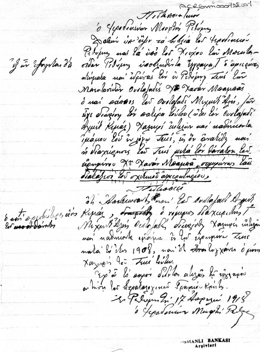 «.....εζητήσαμεν παρά του Ιμπραχήμ βέη όπως διά μαρτύρων αποδείξη την αγωγήν του. Επειδή όμως ούτος ευρέθη εν αδυναμία να αποδείξη διά μαρτύρων τον ισχυρισμόν του, εζήτησε να επιβληθή όρκος εις τον αντίδικόν του.