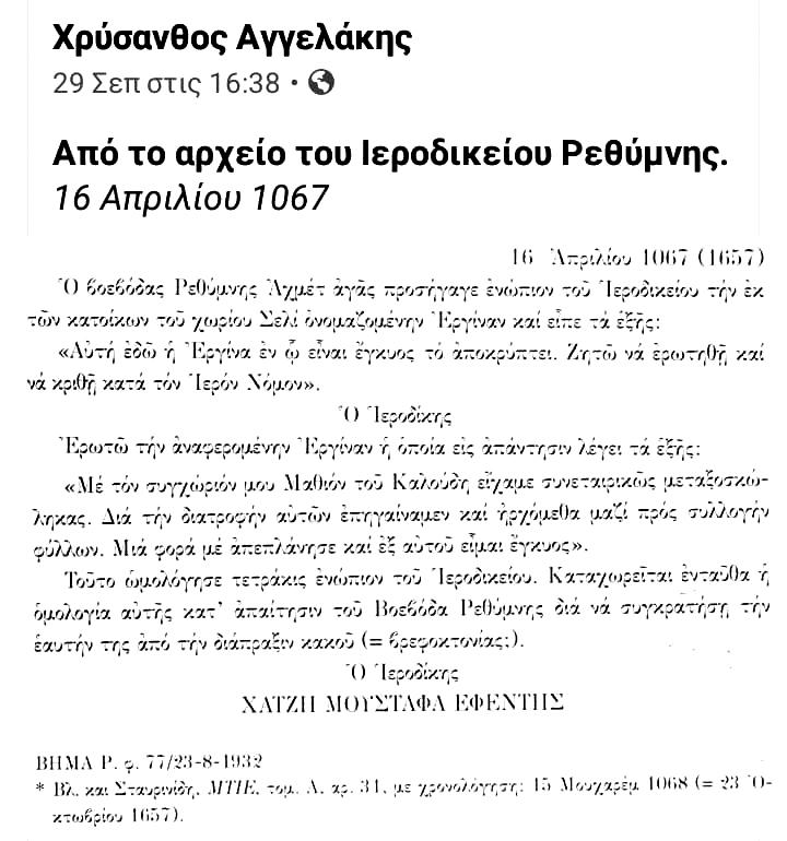Έγγραφο του Ιεροδικείου Ρεθύμνης (16 Απριλίου 1657) μεταφρασμένο από τον Νικ.Σταυρινίδη