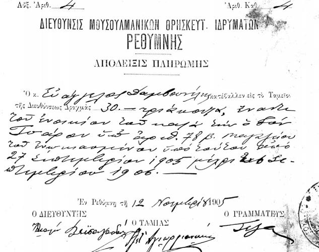 Από αποδείξεις πληρωμής ενοικίων,των καταστημάτων ιδιοκτησίας της Διεύθυνσης Μουσουλμανικών Θρησκευτικών Ιδρυμάτων, χρονολογίας 1902 και 1906,θα μεταφερθούμε νοερά στο Ρέθεμνος των αρχών του 20ού αιώνα και συγκεκριμένα στην οδό Τσάρου, όπως λεγόταν τότε η οδός Αρκαδίου.