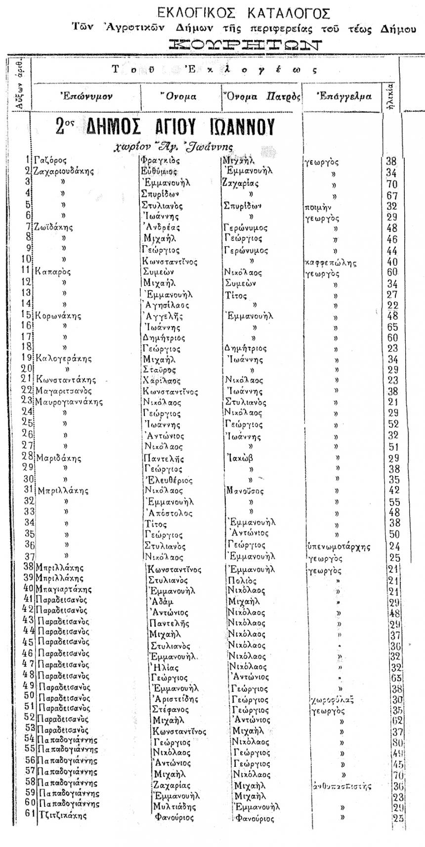 Ο παρακάτω εκλογικός κατάλογος, που είχε την καλοσύνη να μου παραδώσει ο αείμνηστος, αγαπητός καθηγητής-ερευνητής Γιώργος Εκκεκάκης, τυπώθηκε το έτος 1913 σε τυπογραφείο των Χανίων. Αφορά τους ψηφοφόρους του χωριού Άγιος Ιωάννης του Αγροτικού Δήμου Αγίου Ιωάννη και αποτελεί σήμερα ένα πολύτιμο ιστορικό έγγραφο. Είναι γνωστό ότι, τότε δεν ψηφίζανε γυναίκες, γι αυτό στον εκλογικό κατάλογο είναι καταχωρημένοι μόνο άνδρες ψηφοφόροι της εποχής εκείνης του χωριού. Δικαίωμα ψήφου στις Ελληνίδες γυναίκες δόθηκε για πρώτη φορά στις Δημοτικές εκλογές του 1934. Είναι πράγματι ένα αληθινό «ντοκουμέντο» της ιστορίας του χωριού μας, που αξίζει να το διαφυλάξομε και να το αναλύσομε περισσότερο. Καθένας ας αναζητήσει τους παππούδες και προπαππούδες του, για να δει το φύτρο του. Ας είναι αναπαυμένη η ψυχή όλων που αναγράφονται στον κατάλογο αυτό, αλλά και του αείμνηστου φίλου, εκλεχτού Ρεθεμνιώτη, Γιώργου Εκκεκάκη, που με πολλή χαρά μου το προσέφερε πριν από αρκετά χρόνια.
