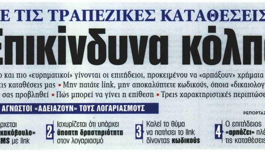 Χαρακτηριστική είναι η υπόθεση μιας κυρίας, η οποία -σύμφωνα με πληροφορίες του MEGA- έλαβε ένα SMS ότι υπάρχει ύποπτη κίνηση στον λογαριασμό της. Εκείνη, όπως δηλώνει, πανικοβλήθηκε και νομίζοντας ότι θα συνδεθεί στον λογαριασμό πληκτρολόγησε τους κωδικούς της.
