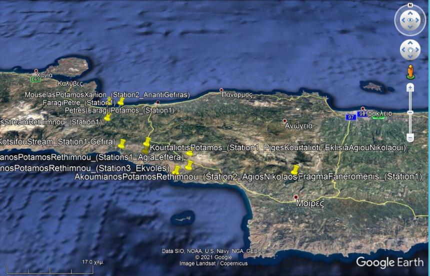 Στο παρακάτω στιγμιότυπο του χάρτη της Κρήτης, με την βοήθεια του ιστότοπου «Google Earth» απεικονίζονται οι θέσεις, (σημάνσεις μερών με κίτρινες «πινέζες»), στις οποίες έχουν πραγματοποιηθεί, μέχρι τώρα, υδρολογικές μετρήσεις σε ρέματα και ποτάμια της Κρήτης, ενώ φιλοδοξία του Θωμά Παπαλάσκαρη είναι να καταστεί ο πρώτος που θα καταρτίσει τον πληρέστερο χάρτη της Κρήτης με τις περισσότερες υδρολογικές μετρήσεις ρυθμών διερχόμενων παροχών νερού, σε πραγματικό χρόνο, συνοδευόμενων και με τα αντίστοιχα φωτογραφικά κα βιντεοσκοπημένα αποδεικτικά στοιχεία όσον αφορά στην μέχρι τώρα υδρολογική ιστορία του νησιού.
