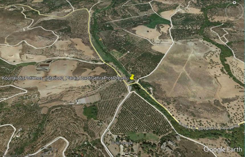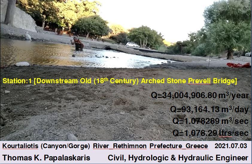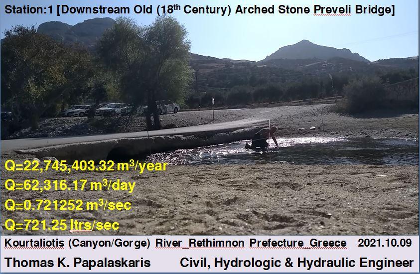 Στην παρακάτω φωτογραφία φαίνεται η παλιά πετρόκτιστη μονότοξη γέφυρα της «Πρέβελης», (η οποία βρίσκεται στον δρόμο για την «Μονή Πρέβελη» και διασχίζει τον «Μεγάλο Ποταμό», («Ποταμός Κουρταλιώτης») ο οποίος καταλήγει στην διάσημη παραλία της «Λίμνης Πρέβελης», ενώ κτίστηκε τον 18ο αιώνα από τους μοναχούς της «Μονής Πρέβελης» και το τόξο της έχει μήκος 1,50 μέτρα, ύψος 7,00 μέτρα και πλάτος 4,50 μέτρα, ενώ εκατέρωθεν αυτής βρίσκονται τοποθετημένες αναθηματικές επιγραφές [3]), στην κατάντη πλευρά της οποίας έγιναν οι μετρήσεις των ρυθμών των παροχών του νερού από τον Θωμά Παπαλάσκαρη, τόσο Σάββατο 03/07/2021 όσο και το Σάββατο, στις 09/10/2021 [3].