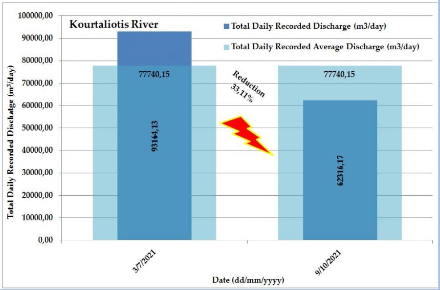Υπενθυμίζεται ότι σύμφωνα με μέτρηση του ρυθμού της διερχόμενης παροχής νερού, που έγινε επίσης το απόγευμα, του Σαββάτου 3 Ιούλη 2021, στην ίδια θέση, (επίσης μετά την διάρκεια έντονου καλοκαιρινού καύσωνα και περιόδου ανομβρίας), αυτός βρέθηκε ίσος με περίπου 93.000 κυβικά μέτρα νερού ημερησίως (m3/day), (για την ακρίβεια 93.164,13 κυβικά μέτρα ημερησίως), δηλαδή 34.004.906,80 κυβικά μέτρα νερού ετησίως (m3/year), δηλαδή μέσα σε χρονικό διάστημα περίπου ίσο με τρεις μήνες υπήρξε μία πτώση του ρυθμού διερχόμενης παροχής νερού, στον «Ποταμό Κουρταλιώτη», κατά περίπου 33% (για την ακρίβεια 33,11%).
