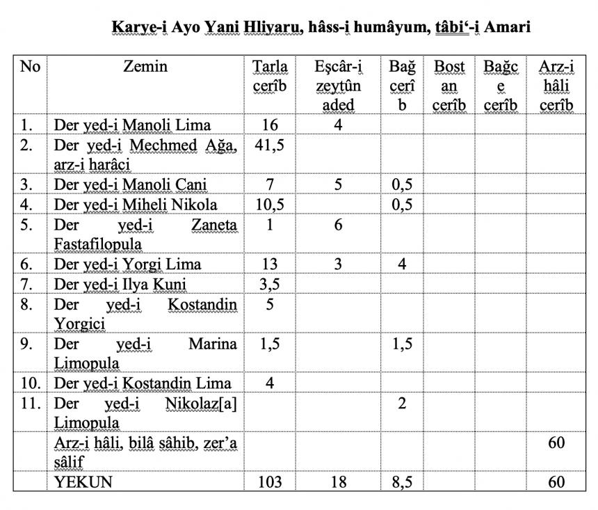 Από τον πίνακα αυτό του κατάστιχου προκύπτουνε συνοπτικά οι κάτοχοι των φορολογήσιμων ιδιοκτησιών της εποχής εκείνης του χωριού Άγιος Γιάννης Χλιαρός: : Μανώλης Λίμας, Μεχμέτ Αγάς, Μανώλης Τζανής, Μιχελής Νικόλας, Ζανέτα Φασταφιλοπούλα, Γιώργος Λίμας, Ηλίας Κουνής, Κωσταντίν Γιωργίτσης, Μαρίνα Λιμοπούλα, Κωσταντίν Λίμας και Νικολάζα Λιμοπούλα, καθώς και τα χωράφια, τα λιόδενδρα και τ’ αμπέλια τους και ο φόρος που πρέπει να πληρώσουνε, που ανέρχεται σε 4.938 άσπρα, δηλαδή ασημένια Οθωμανικά νομίσματα (η μικρότερη νομισματική μονάδα).