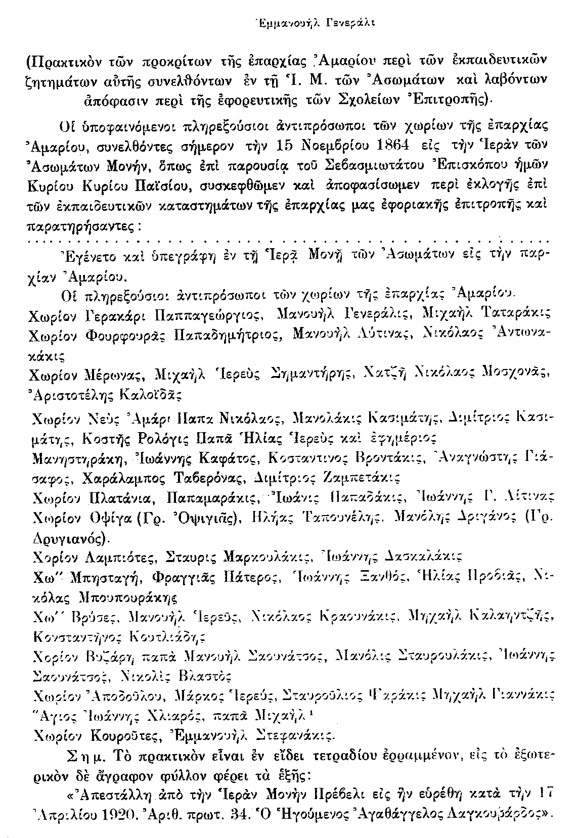 Το άλλο έγγραφο όπως αναφέρεται είναι [2]: «Πρακτικόν των προκρίτων της Επαρχίας Αμαρίου περί των εκπαιδευτικών ζητημάτων αυτής συνελθόντων εν τη Ι.Μ. των Ασωμάτων και λαβόντων απόφασιν περί της Εφορευτικής των Σχολείων Επιτροπής». Το έγγραφο αυτό έχει ημερομηνία 15 Νοεμβρίου 1864 και μεταξύ των πληρεξουσίων αντιπροσώπων των χωριών της επαρχίας Αμαρίου που το υπογράφουνε συμπεριλαμβάνεται και από «Άγιος Ιωάννης Χλιαρός παπά Μιχαήλ», με επεξήγηση στην Τουρκική γλώσσα «Μιχαήλ Μαρκάκι».