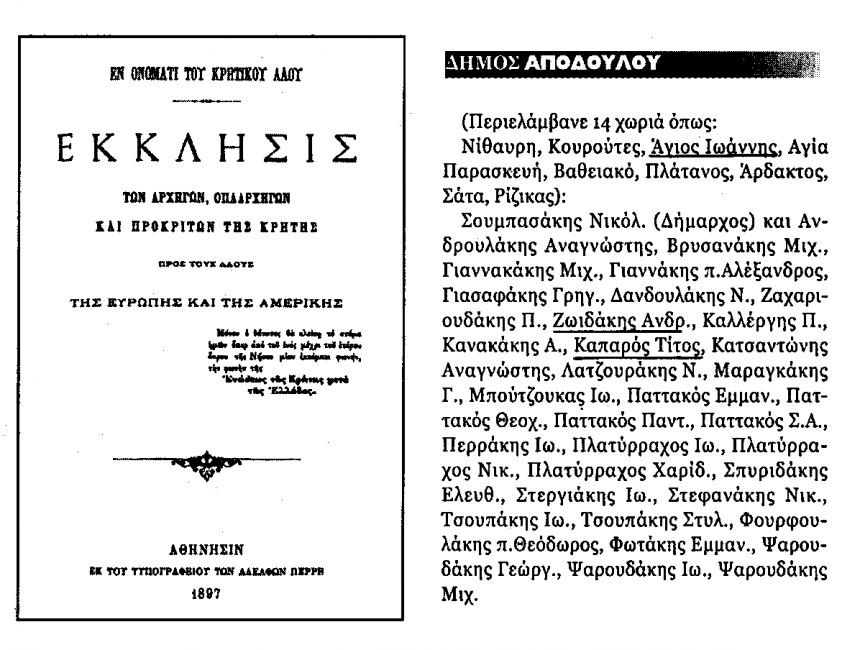1.Γεώργιος Π. Εκκεκάκης, Ονομαστικοί κατάλογοι σ’ ένα σπάνιο φυλλάδιο του 1897-Εφημερίδα Κρητική Επιθεώρηση της 5-1-2006, σ. 14-15.