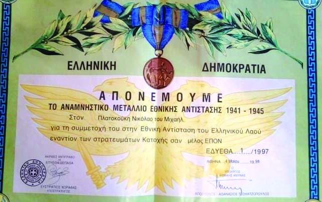 Ο Νίκος Πλατοκούκης αναγνωρίστηκε με το υπ’ αριθμ. 3/1989 πρακτικό σαν Αγωνιστής Εθνικής Αντίστασης και του έδωσαν δίπλωμα και μετάλλιο.
