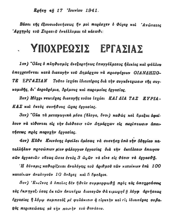 Οι Γερμανοί καταλαμβάνουν την Κρήτη το Μάιο του 1941 και στις 17 Ιουνίου της ίδια χρονιάς ο Χίτλερ κοινοποιεί την υποχρέωση εργασίας την οποία υπογράφει ο Στρατιωτικός Διοικητής Φρουρίου Κρήτης.