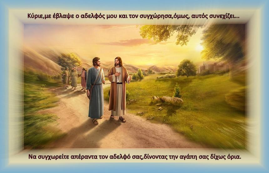 ΙΗΣΟΥΣ : Σου λέω ,λοιπόν, Πέτρο, να συγχωρείτε απέραντα τον αδελφό σας, δίνοντας την αγάπη σας ,δίχως όρια, παραμερίζοντας τα πάθη σας.