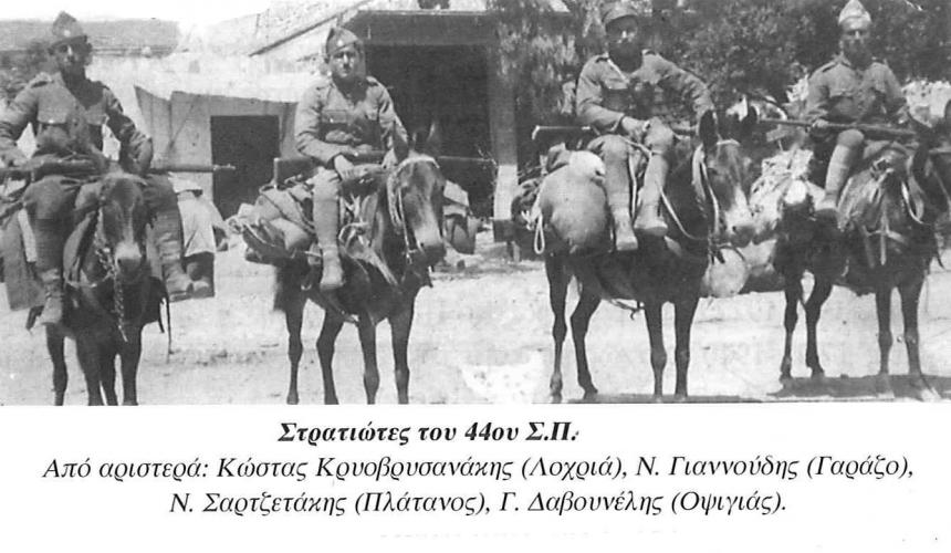 Το διάστημα αυτό γινόταν επίταξη των ζώων από τα χωριά του νομού. Εμείς είχαμε καταυλιστεί στα Τρία Μοναστήρια και μέναμε σε αντίσκηνα. Στις 28 Οκτωβρίου 1940, τη μέρα που το Ρέθυμνο γιόρταζε τη μνήμη των Τεσσάρων Μαρτύρων, πληροφορηθήκαμε την άδικη κι άτιμη ενέργεια των Ιταλών να μας κηρύξουν τον πόλεμο. Ο συνταγματάρχης Ι. Σέρβος μας μίλησε για την αποστολή μας και για το καθήκον μας προς την πατρίδα.