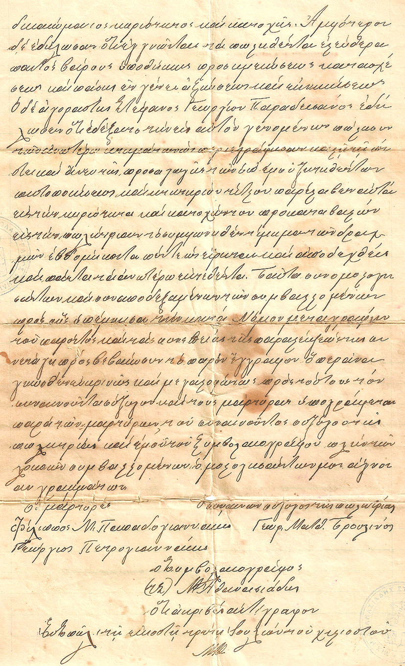 Μάρτυρες υπογράφουνε οι : Φίλιππος Μιχαήλ Παπαδογιαννάκης και Γεώργιος Αποστόλου Περογιαννάκης, κάτοικοι Μελάμπων.