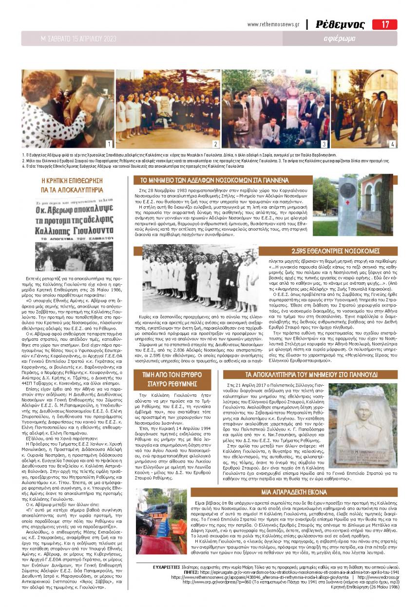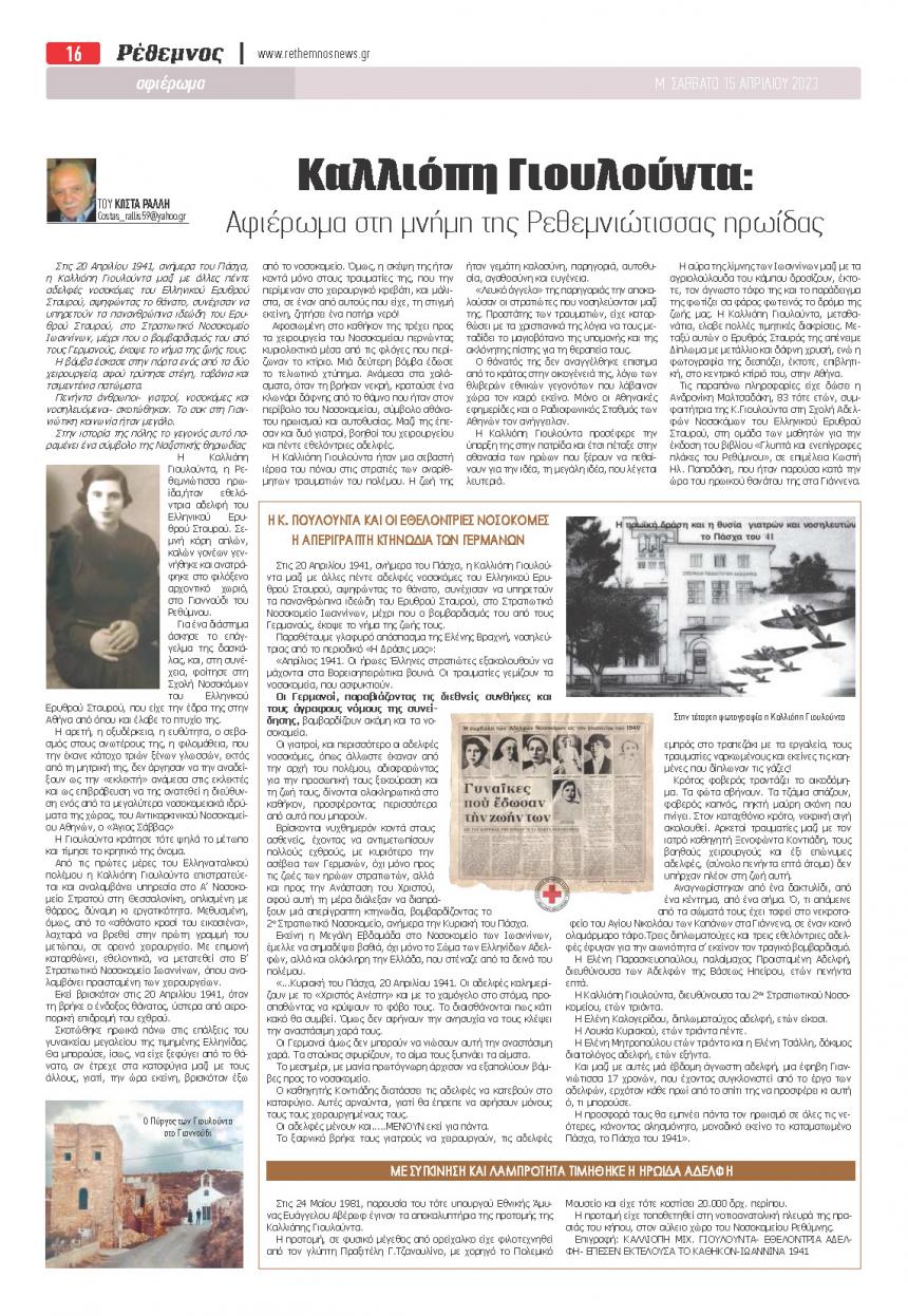 ΑΠΟΨΕΙΣ 18.04.2023 11:20Καλλιόπη Γιουλούντα: Αφιέρωμα στη μνήμη της Ρεθεμνιώτισσας ηρωίδας Κώστας Ράλλης Facebook Twitter Copy link 0 0 Facebook Twitter Copy link ΣΧΕΤΙΚΑ ΑΡΘΡΑ Απόψεις 05.03.2025 10:00Ο «Πέτρινος Καφενές» του Νουρί Μπέη στο Ρέθεμνος κάτω από το μεγάλο πλάτανο στο Μειντάνι Απόψεις 28.01.2025 10:30Τα παραλειπόμενα της ανέγερσης του Νοσοκομείου Ρεθύμνης Απόψεις 26.11.2024 11:00Έξι μέρες στην Πόλη Απόψεις 16.09.2024 16:36Άγιος Γεώργιος: ο μικρός οικισμός στο δυτικό Ρέθυμνο απ’ όπου δόθηκε το έναυσμα για την έναρξη των εχθροπραξιών στο κίνημα του 1889
