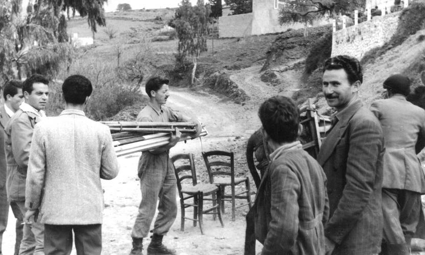 Η φωτογραφία του σημειώματος δεν είναι από έργα μέσα στο χωριό, αλλά από μεταφορά τοπογραφικών εργαλείων (τρίποδα, σταδίες κλπ) στην ύπαιθρο, την οποία είχε αναλάβει επί πληρωμή ο Γεώργιος Γιαννουλάκης του Φραγκιά, για την προμέτρηση του (στοιχειωμένου) Φράγματος Πλατύ ποταμού το έτος 1960, στην οποία και συμμετείχα.