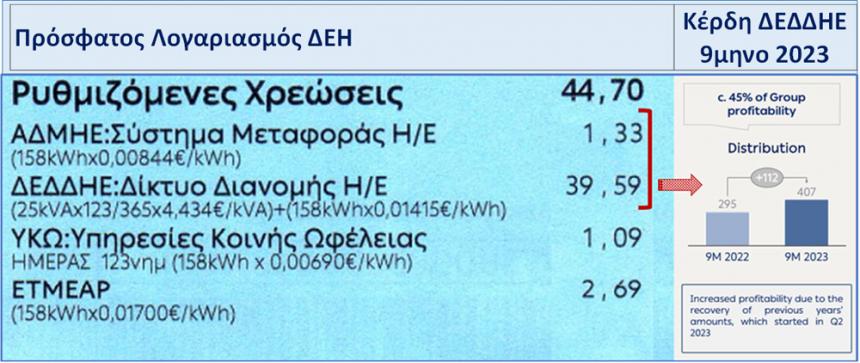 Στις 9/11/2023 η ΔΕΗ ΑΕ ανακοίνωσε τα οικονομικά αποτελέσματα εννεαμήνου 2023, (μάλιστα με παρουσίαση μόνο στα Αγγλικά, σαν να μην είναι Ελληνική εταιρεία!) Περίπου 45% της κερδοφορίας του Ομίλου ΔΕΗ προέρχεται από τη δραστηριότητα του Δικτύου Διανομής, το γνωστό σε όλους μας ΔΕΔΔΗΕ (Διαχειριστής Δικτύου Διανομής Ηλεκτρικής Ενέργειας). Πιο συγκεκριμένα, στο 9μηνο 2023 τα κέρδη του ΔΕΔΔΗΕ ήταν 407 εκατ. ευρώ, έναντι 295 εκατ. ευρώ στο 9μηνο 2022. Μάλιστα αυτή η εντυπωσιακή αύξηση κερδών (επιπλέον 112 εκατ. ευρώ σε ένα χρόνο), προέκυψε ενώ η ζήτηση ηλεκτρισμού στη χώρα ήταν μειωμένη κατά 3,5% στο 9μηνο 2023 σε σχέση με το 9μηνο 2022.