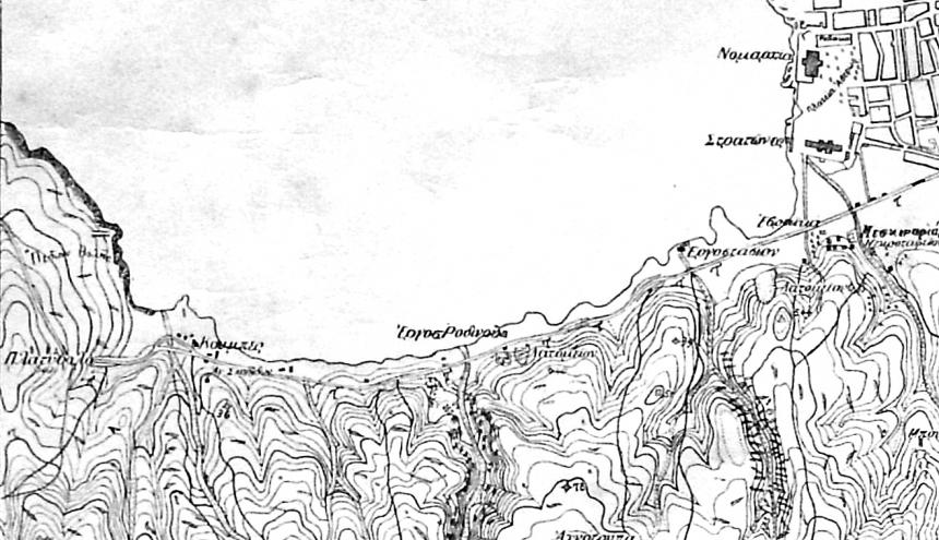 Μ’ ένα ακόμα χρονικό άλμα βρισκόμαστε στο έτος 1925. Εν τω μεταξύ τα πράγματα είχαν αλλάξει και η μέθοδοι της τοπογραφίας (τριγωνισμός) παρέδιδαν πια ακριβείς χάρτες, όπως ο συγκεκριμένος στρατιωτικός, που εκπονήθηκε από τον λοχαγό Κωνσταντίνο Παπαθανασίου και το συνεργείο του. Διακρίνεται μια ήδη βιομηχανική περιοχή, στην οποία κυριαρχεί το εργοστάσιο Ροδινού. Διακρίνεται επίσης η περιοχή «Εβραϊκά», το εργοστάσιο της Αγίας Φωτεινής, το νταμάρι του Λαμέρα, όπως κι ένα ακόμα λίγο δυτικότερα, ο Κουμπές και τα πέριξ κτίσματα των ταμπακαριών και ο σπηλαιώδης Άγιος Σπυρίδωνας. Σ’ ολόκληρη δηλαδή αυτή την έκταση ένα αιώνα πριν υπήρχαν μόλις 18 κτίσματα, ενώ στη θέση τού μεταγενέστερου στρατοπέδου σημειώνεται κάποιο υποτυπώδες «Πεδίο βολής».