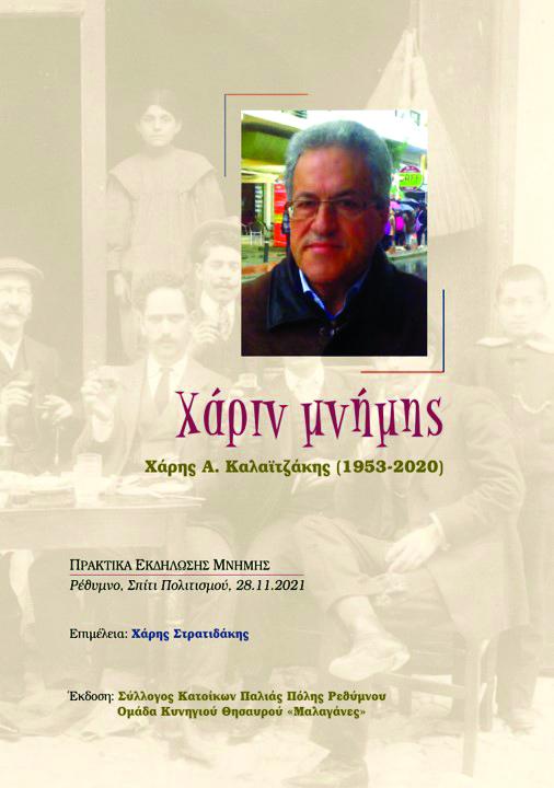 Συμπληρώνονται αυτές τις μέρες τρία χρόνια από την αδόκητη εκδημία του Χάρη Καλαϊτζάκη. Διετέλεσε πολίτης χρήσιμος στην κοινωνία για τις νομικές του υπηρεσίες αλλά και για την πνευματική του προσφορά («Τα καφενεία του Ρεθύμνου» κ.ά.). Αποτέλεσε πρότυπο οικογενειάρχη αλλά και νηφαλιότητας και κριτικής σκέψης. Στη μνήμη του είχαμε διοργανώσει με τον Σύλλογο Κατοίκων Παλιάς Πόλης και την Ομάδα Κυνηγιού «Μαλαγάνες» εκδήλωση, στην οποία μίλησαν ο Θωμάς Κρεβετζάκης, η Ελένη Τζέτζου, η Ελένη Γιαννακάκη, ο Μάνος Τσάκωνας, ο Μανόλης Μακριδάκης και ο υπογραφόμενος, ενώ εκ μέρους της οικογένειας είχε αντιφωνήσει ο Αντώνης Καλαϊτζάκης. Πολλοί συμπολίτες που ήθελαν να παρευρίσκονται δεν τα είχαν καταφέρει, αφού διανύαμε την περίοδο αποδρομής του κορονοϊού. Αυτοί μπορούν να αποζημιωθούν εν μέρει από την ανάγνωση του μικρού βιβλίου που είχαμε τότε τυπώσει και διανείμει με τις εισηγήσεις της εκδήλωσης και από το οποίο υπάρχουν ακόμα αντίτυπα για διάθεση. Ας είναι μακρά η μνήμη του!