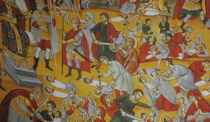 Υ.Γ. Η φωτογραφία είναι λεπτομέρεια από τοιχογραφία του Καθολικού της Ιεράς Μονής Ξηροποτάμου Αγίου Όρους και απεικονίζει την βρεφοκτονία των νηπίων από τον Ηρώδη.