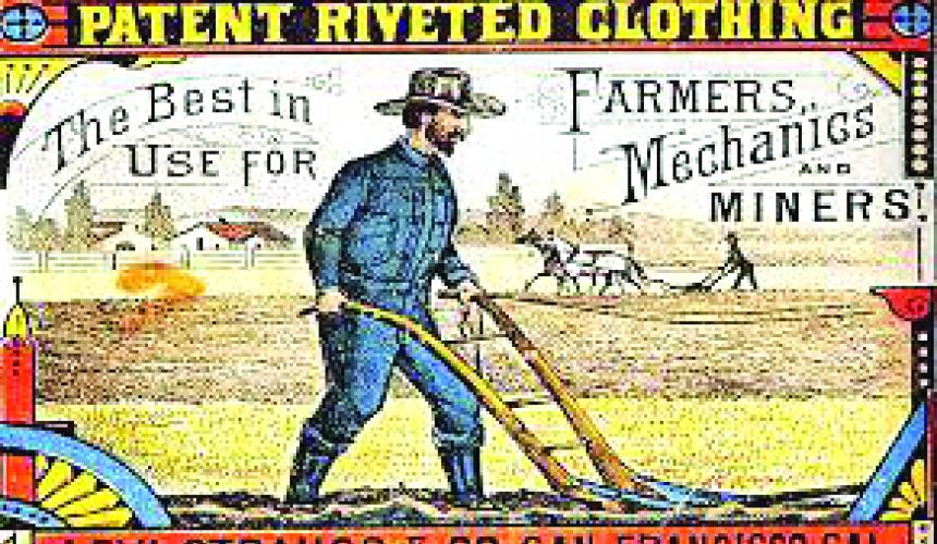 Μπλου τζιν λοιπόν, μια ανθεκτική φόρμα εργασίας, ένα ανάρπαστο καθημερινό ρούχο των γεωργών, των μηχανικών και μεταλλωρύχων, όπως απεικονίζεται σε μια ρεκλάμα της εποχής και βεβαίως των cow-boys.