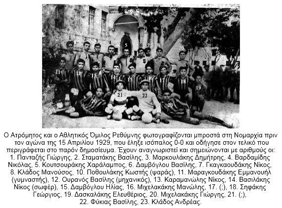 Στις 24-5-1930 έγινε στο Ρέθυµνο στην πλατεία Αβέρωφ (Νοµαρχίας), παρουσία του επισκόπου κ. Τιµοθέου και Αρχών, το πρώτο µεγάλο φιλικό µε τον ΟΦΗ, µε την οµάδα του Ηρακλείου να κερδίζει 3-0, ενώ ήρθε στην πόλη µας µε το ατµόπλοιο «Κανάρης».