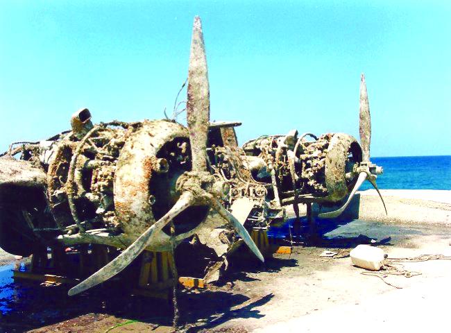 Λίγο βορειότερα, μέσα από τη θάλασσα, είχε ανελκυστεί ένα συμμαχικό αεροπλάνο, το οποίο σήμερα κοσμεί το Μουσείο της Πολεμικής Αεροπορίας στη Δεκέλεια του Τατοΐου. Η αντιαεροπορική άμυνα του αεροδρομίου το είχε καταρρίψει κατά λάθος το 1941 κι είχε πέσει στα ανοιχτά του Σταυρωμένου-Παγκαλοχωρίου. Την ανέλκυσή του και τη μεταφορά στη Μαρίνα του Ρεθύμνου, όπου επαναβυθίστηκε για κάποιους μήνες, είχαμε παρακολουθήσει με αγωνία οι Ρεθεμνιώτες (εδώ σε φωτογραφία του Γιώργου Καλούδη).