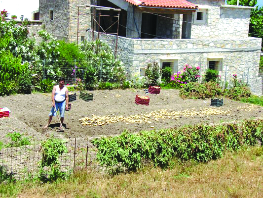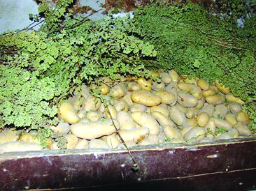 15. Πρόβλημα αποτελούσε όμως η αποθήκευση της πατατοπαραγωγής, έτσι ώστε να καλύπτουν τη μισή τουλάχιστον διάρκεια του έτους, στις περιοχές που καλλιεργούνταν δύο φορές τον χρόνο, ή κι ολόκληρη τη χρονιά στις υπόλοιπες. Σήμερα η αποφυγή «κεντρουλιάσματος», αναπαραγωγής δηλαδή του φυτού, επιτυγχάνεται με φάρμακα «του γεωπόνου» υψηλής επικινδυνότητας, παλιότερα όμως αυτό γινόταν με την αποθήκευσή τους σε αεριζόμενες «κρεβάτες», οι οποίες σκεπάζονταν με αρωματικά φυτά, όπως φαίνεται και στην παρατιθέμενη φωτογραφία από χωριό του Μυλοποτάμου, συγκεκριμένα με κλωνάρια ρίγανης.