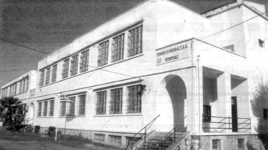 Νωρίς το πρωί, φτάσαμε στην Πόμπια και βρεθήκαμε στο σχολείο. Από την πρώτη στιγμή ένιωσα δέος. Ένας απέραντος χώρος, με περίπου 200 παιδιά από όλα τα χωριά της επαρχίας Καινουργίου, Πυργιωτίσσης, Μονοφατσίου αλλά και τα ανατολικά του Αμαρίου και του Αγίου Βασιλείου. Με τα κοντά παντελονάκια μου χάζευα το μελλοντικό μου «σπίτι» που με τρόμαζε και με γοήτευε ταυτόχρονα. Ήταν από τις λίγες φορές που βρέθηκα στο κεφαλοχώρι της περιοχής και κάθε γωνιά, κάθε πρόσωπο, μου φάνταζε ως κάτι νέο, γεμάτο υποσχέσεις για κάτι μεγαλύτερο και άγνωστο.
