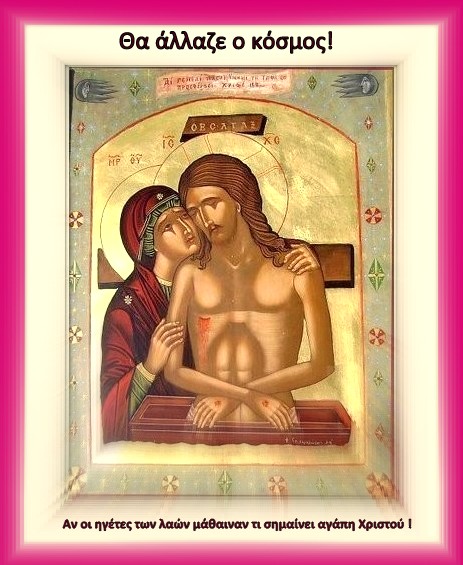 Θα άλλαζε ο κόσμος, αν ακολουθούσαμε την ανηφοριά του Γολγοθά, αν κατανοούσαμε, αν κλαίγαμε και πονούσαμε για τον πλησίον μας, αν ανοίγαμε την καρδιά μας και δίναμε την αγάπη μας στον άνθρωπο, αν προστρέχαμε, αν παρηγορούσαμε, αν προσφέραμε από το υστέρημα μας.