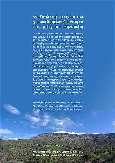 Οι αναγνώστες θα μου επιτρέψουν εδώ μια ατομική κατάθεση. Στις 13 Αυγούστου 2013 με είχε προσκαλέσει στις Κουρούτες ο εκεί Πολιτιστικός Σύλλογος, να δώσω μια διάλεξη-προβολή, με τον τίτλο «Αναζητώντας στοιχεία του κρητικού διατροφικού πολιτισμού στις ρίζες του Ψηλορείτη» (αφίσα στην προηγούμενη εικόνα). Φτάσαμε στο χωριό με μερικούς φίλους, έδωσα τη διάλεξη και στη συνέχεια τύχαμε αβραμιαίας φιλοξενίας όλοι οι συμμετέχοντες, με χειροποίητα παρασκευάσματα των νοικοκυράδων του χωριού. Αργά το βράδυ πια οι χωριανοί μας κατευόδωσαν κι εμείς γυρίσαμε ευχαριστημένοι στα σπίτια μας. Μετά από καιρό έμαθα κατά τύχην ότι το ίδιο εκείνο απόγευμα οι Κουρουθιανοί «είχαν λείψανο» στο χωριό τους και μάλιστα ενός σημαίνοντος χωριανού. Όμως, εφαρμόζοντας στην πράξη το παραπάνω ριζίτικο, δεν μας είπαν απολύτως τίποτα και συμμετείχαν κανονικά στην εκδήλωση. Μόνο όταν φύγαμε οι καλεσμένοι, τότε πήγαν στο σπίτι που πενθούσε για να ξενυχτίσουν τον χωριανό τους!