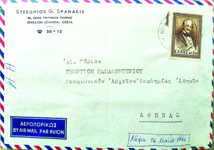 Πριν από μερικά χρόνια, εντόπισα σε παλαιοβιβλιοπωλείο και αγόρασα τον τόμο III της σειράς «Μνημεία Κρητικής Ιστορίας», ο οποίος περιλαμβάνει την έκθεση (1594) του Pilippo Pasqualigo, «τέως Καπετάνιου του Χάνδακος και Προβλεπτού των Χανίων», προς την Ενετική Γερουσία. Στην τιμή του βιβλίου, που εκδόθηκε το 1953 και ο πρόλογός του γράφτηκε από τον Καλιτσουνάκη, περιλαμβανόταν και ένας ταχυδρομικός φάκελος που περιείχε τρεις επιστολές, οι οποίες συντάχθηκαν και ταχυδρομήθηκαν το 1966. Οι επιστολές αυτές έχουν την πρωτότυπη υπογραφή των συντακτών τους. Κράτησα -επί του παρόντος- το βιβλίο, το οποίο περιλαμβάνει και χειρόγραφη αφιέρωση του Σπανάκη προς τον αποδέκτη του, αλλά οι επιστολές βρίσκονται ήδη, από τον Απρίλιο του 2025, στη Βικελαία Δημοτική Βιβλιοθήκη Ηρακλείου, προκειμένου να συμπληρώσουν το αρχείο του Στέργιου Σπανάκη που φυλάσσεται εκεί. Οι επιστολές αφορούν στην αλληλογραφία για τη σχεδιαζόμενη εκείνη την εποχή έκδοση της έκθεσης του Basilicata, μεταξύ του Σπανάκη και του Γεωργίου Αντ. Παπαδημητρίου (1920-2007), φιλόλογου και παλαιογράφου[1], τότε υπαλλήλου (1959-1985) του «Αρχείου της μέσης Ελληνικής γλώσσης» ή Μεσαιωνικού Αρχείου, της Ακαδημίας Αθηνών, το οποίο είχε ιδρυθεί το 1930 με σκοπό τη σύνταξη Λεξικού της Μεσαιωνικής Ελληνικής Γλώσσας, με την πάροδο του χρόνου όμως επέκτεινε τις επιστημονικές του δραστηριότητες και τον Σεπτέμβριο του 1966, με ΝΔ, μετονομάστηκε και επίσημα σε Κέντρο Ερεύνης του Μεσαιωνικού και Νέου Ελληνισμού (ΚΕΜΝΕ). Διευθυντές του Αρχείου την περίοδο που προηγήθηκε της αλληλογραφίας, υπήρξαν και οι Κρητικοί Εμμανουήλ Κριαράς (1939-1950) και Μανούσος Μανούσακας (1951-1961)[2]. Στις δύο από τις επιστολές (18-4-1966 & 23-5-1966) αποστολέας είναι ο Στέργιος Σπανάκης και αποδέκτης ο Γεώργιος Παπαδημητρίου, ενώ στην τρίτη (22-5-1966) συμβαίνει το αντίστροφο, με την διαφορά ότι η επιστολή αυτή αποτελεί «Αντίγραφο» της επιστολής που ο Παπαδημητρίου έστειλε στον Σπανάκη (ουσιαστικά είναι «σχέδιο» της) και περιλαμβάνει και εγγραφές που τελικά διέγραψε ο αποστολέας και δεν «πέρασαν» στην τελική επιστολή που ταχυδρομήθηκε. Η από 18-4-1966 επιστολή του Σπανάκη δεν στάλθηκε ταχυδρομικά αλλά μεταφέρθηκε στον Παπαδημητρίου, στο Μεσαιωνικό Αρχείο, από έναν Κρητικό φοιτητή στην Αθήνα, ανιψιό του Σπανάκη (αυτό αναφέρεται στην από 23-5-1966 επιστολή).
