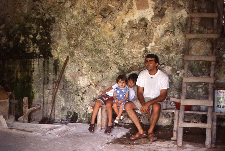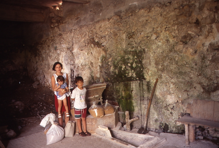Φρόντισα κιόλας μια φορά να γίνουμε «απαλέτες» όλη η οικογένειά μου, όπως φαίνεται στις δύο πρώτες φωτογραφίες. Περιττό ν’ αναφέρω ότι τα παιδιά μου εντυπωσιάστηκαν όχι μόνο από την υποβλητική ατμόσφαιρα που δημιουργούσε το ημίφως, η υγρασία και ο ρυθμικός ήχος του αλέσματος αλλά κι από τα ίδια τα λεγόμενα του μυλωνά. Ο οποίος, να το σημειώσουμε κι αυτό, ήταν όχι μόνο ιδιοκτήτης και δουλευτής του μύλου αλλά και επισκευαστής του στις συχνές ζημιές που πάθαινε συχνά-πυκνά.