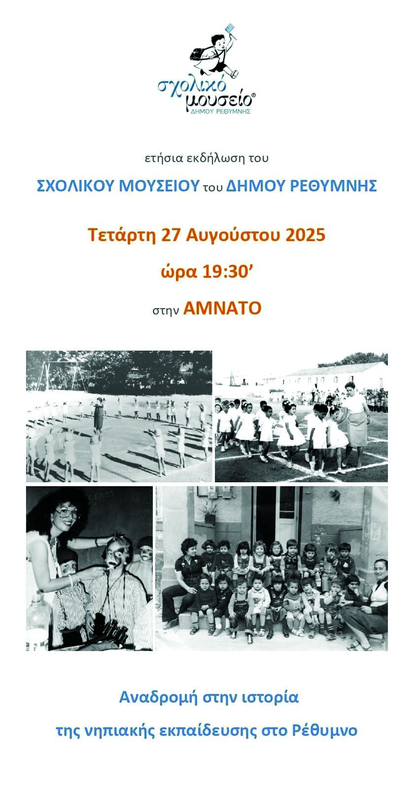 Την Τετάρτη 27 Αυγούστου πραγματοποιούμε στο Σχολικό Μουσείο, στις εγκαταστάσεις του στην Αμνάτο, την καθιερωμένη ετήσια εσπερίδα, που εφέτος έχει ως θέμα την ιστορία της ρεθεμνιώτικης νηπιακής εκπαίδευσης. Στο δεύτερο μέρος της εκδήλωσης θα τιμηθούν τέσσερις προσωπικότητες που την υπηρέτησαν, σε δημόσια και ιδιωτικά νηπιαγωγεία. Πρόκειται για τις νηπιαγωγούς Άννα Μουνδριανάκη-Τζαγκαράκη και Αργυρή Λαγουβάρδου-Πατσαχάκη, την ιδιοκτήτρια του νηπιαγωγείου «Τα Χελιδόνια» Σταυρούλα Τσερβάκη-Λαγκουβάρδου και την πρώτη σχολική σύμβουλο νηπιαγωγών Αγγέλα Μάλμου.