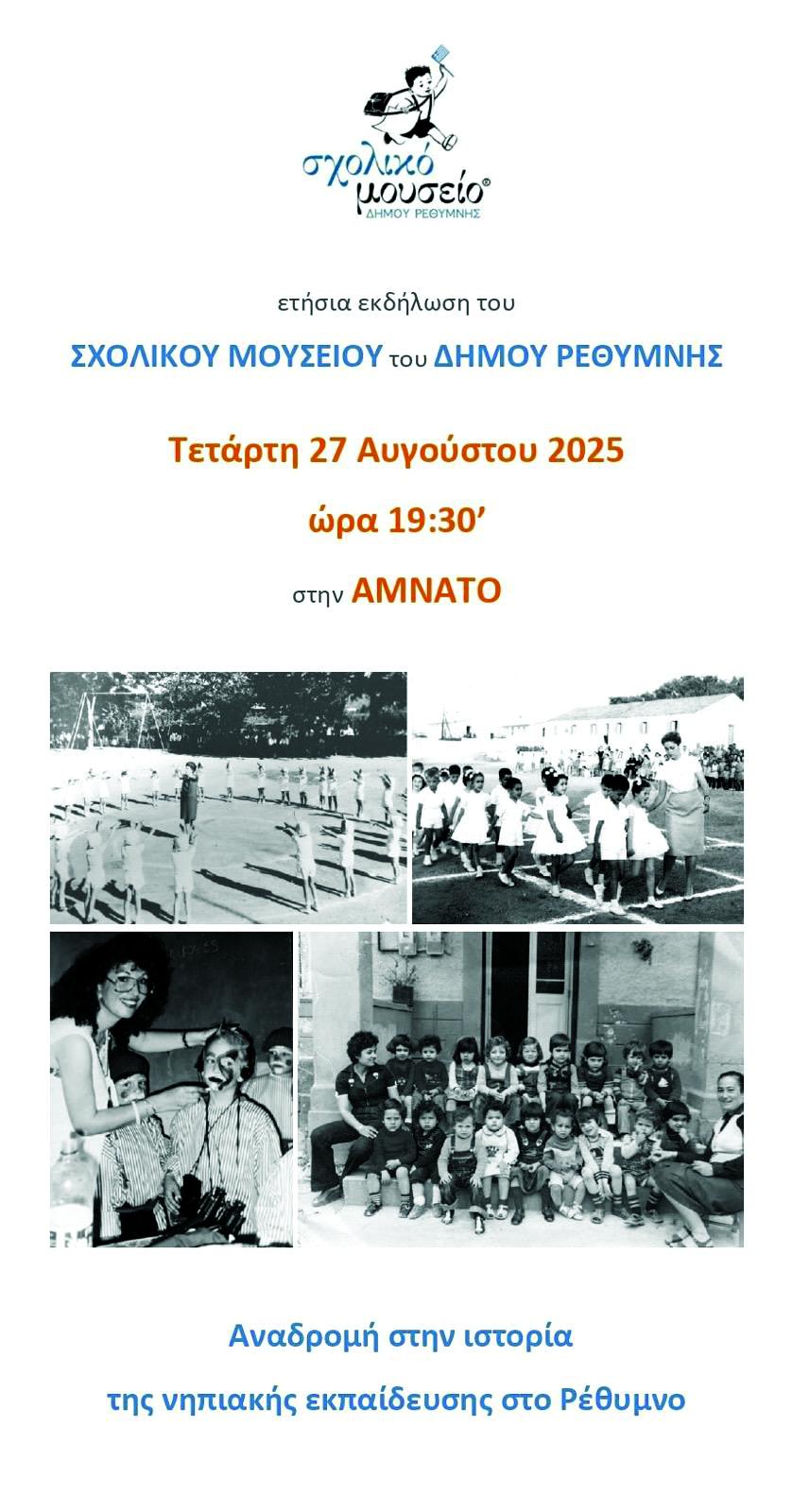 Κάτι μου λέει ότι θα είστε εκεί, τόσο εσείς όσο και οι δημοτικές και εκπαιδευτικές αρχές, για να τους τιμήσουμε ακούγοντας τις ιδέες τους, τα προβλήματα που αντιμετώπισαν, τις χαρές που πήραν και τα επόμενα βήματα που ασφαλώς σχεδιάζουν. Είμαι σίγουρος, και το έχω γράψει και σε άλλη περίσταση, ότι δεν είμαστε οι Ρεθεμνιώτες ούτε επιλήσμονες ούτε και αγνώμονες. Ίσως λίγο αμελείς και αναβλητικοί…».