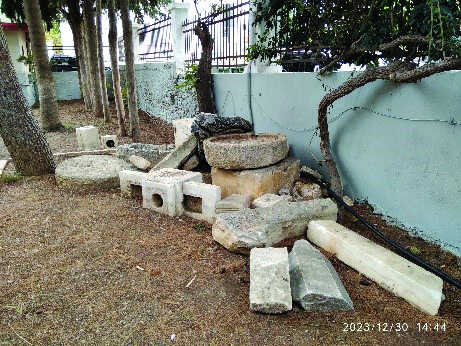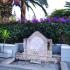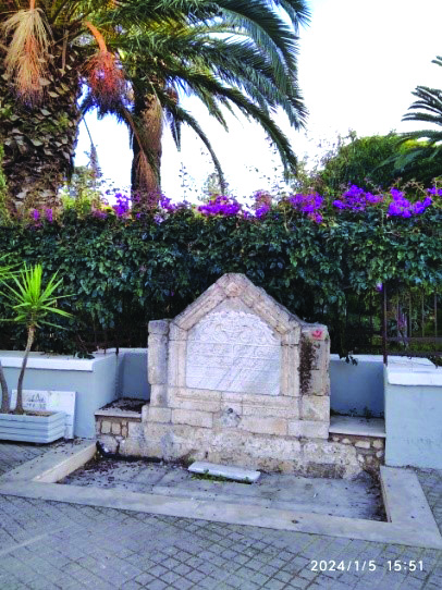 Η «ορφανή» επιγραφή είναι, θα έλεγα, μια… «μετανάστρια» ή μια «προσφυγοπούλα». Βρισκόταν στη Μεσκηνιά, την περιοχή μεταξύ του Τιμίου Σταυρού και του σημερινού νεκροταφείου που κατοικούσαν απομονωμένοι οι λεπροί ή αλλιώς μεσκήνηδες. Μεταφέρθηκε στη σημερινή της θέση λόγω της κατεδάφισής της κατά τη διάνοιξη της οδού Ηλιακάκη. Για πολλά χρόνια η επιγραφή φορούσε… αδιαφανή φερετζέ, καθώς βαφόταν μαζί με τον τοίχο του κήπου (τι, θα κάνουμε διακρίσεις;), ώσπου καθαρίστηκε από την αρχαιολογική υπηρεσία και έχει τη σημερινή της μορφή. Η μεταφορά της στο σημείο αυτό ήταν πολύ καλή επιλογή λόγω της εντυπωσιακής φυτικής διακόσμησης της, που δένει με τον κήπο, αλλά και λόγω του κεντρικού σημείου της θέσης της. Μήπως ταίριαζε να αποκατασταθεί έστω και μερικά το μνημείο με μια κρήνη με νερό ή ακόμη και να φωτιστεί; Μήπως, λέω.