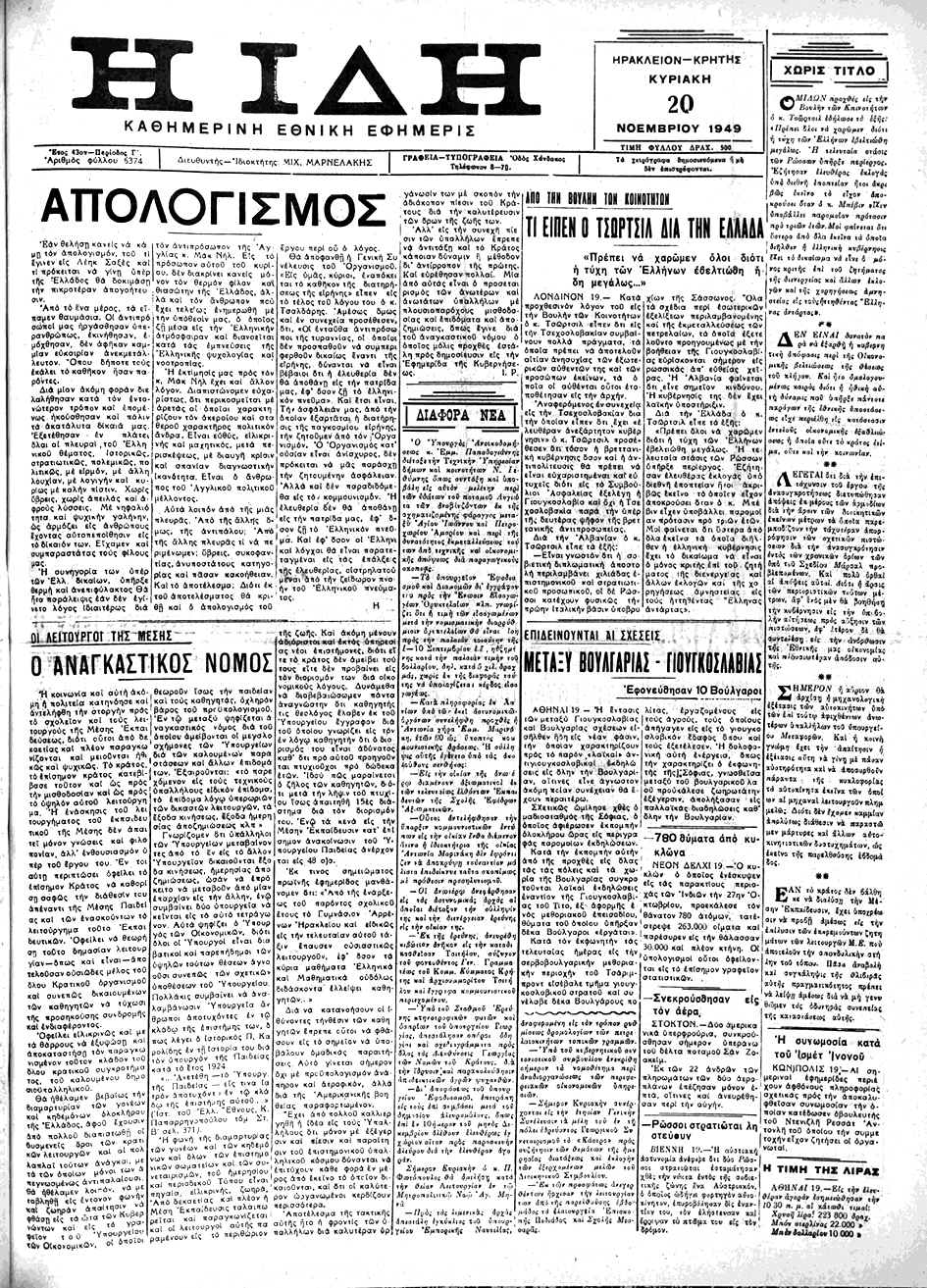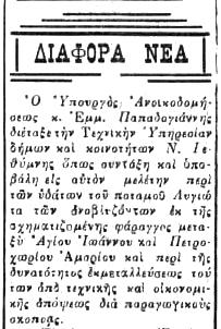 Εφημερίς Η ΙΔΗ Ηρακλείου, Κυριακή 20 Νοεμβρίου 1949, Αριθμός Φύλλου 6374. ΔΙΑΦΟΡΑ ΝΕΑ « Ο Υπουργός Ανοικοδομήσεως κ. Εμμ. Παπαδογιάννης διέταξε την Τεχνικήν Υπηρεσίαν δήμων και κοινοτήτων Ν. Ρεθύμνης όπως συντάξη και υποβάλη εις αυτόν μελέτην περί των υδάτων του ποταμού Λυγιώτα των αναβλυζόντων εκ της σχηματιζομένης φάραγγος μεταξύ Αγίου Ιωάννου και Πετροχωρίου Αμαρίου και περί της δυνατότητος εκμεταλλεύσεως τούτων από τεχνικής και οικονομικής απόψεως δια παραγωγικούς σκοπούς.»