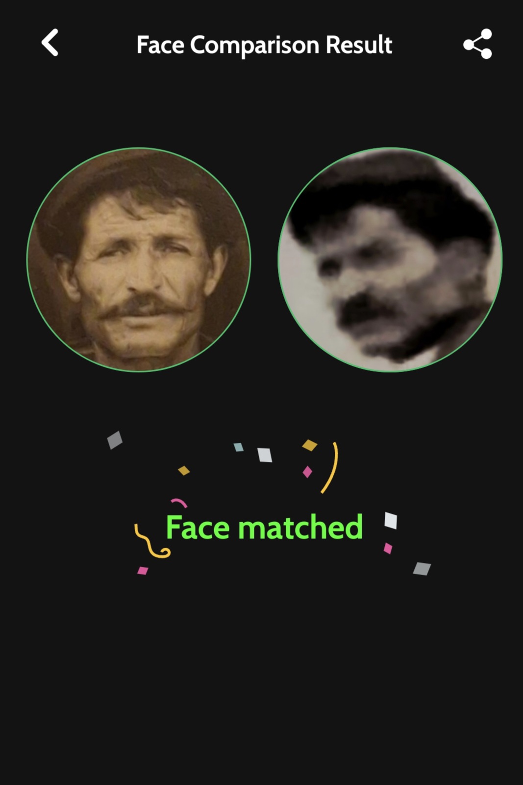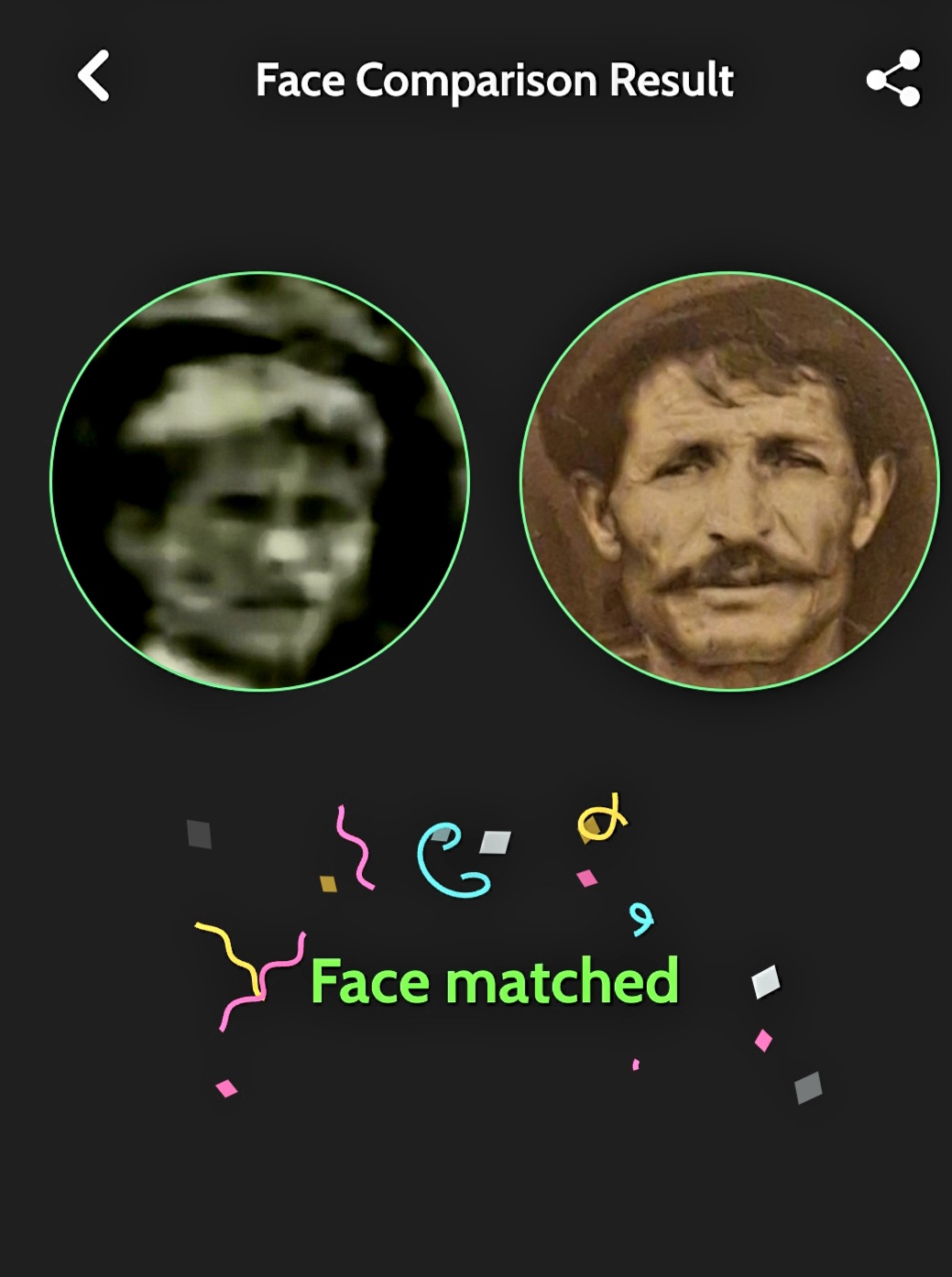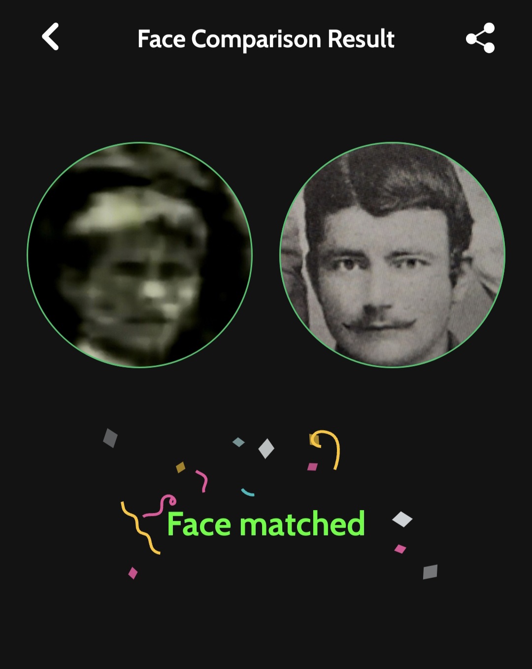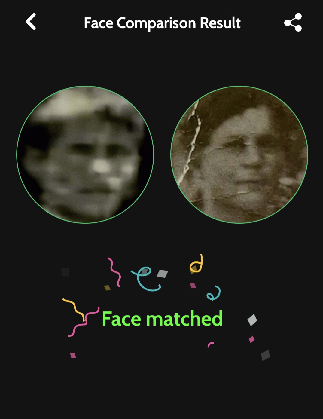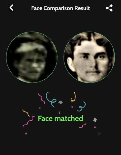 4. Σύγκρινα, αρχικά με το μάτι, τη φωτογραφία του προσώπου του αγοριού, που πλέον ήταν καθαρότερη από την αρχική, με παλιές φωτογραφίες Κουρουθιανών, και από το δικό μου άλμπουμ παλιών οικογενειακών φωτογραφιών, αλλά, κυρίως, με φωτογραφίες από τα ημερολόγια του Συλλόγου Κουρουθιανών της Αθήνας που εκδόθηκαν τα έτη 2021, 2022 και 2023, με επιμέλεια του προέδρου του συλλόγου, Αντώνη Γ. Νουκάκη. Στη συνέχεια, χρησιμοποίησα την εφαρμογή Face Recognition & Compare (Rising Apps Solutions, Google Play Store, έκδοση Οκτωβρίου 2025) που προσφέρει τη δυνατότητα σύγκρισης μεταξύ δύο προσώπων και χρησιμοποιεί προηγμένους αλγόριθμους αναγνώρισης προσώπου (πιθανότατα Deep Learning/CNN) για σύγκριση.