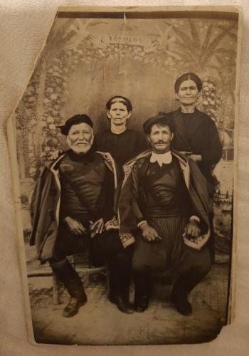 Από τις συγκρίσεις των φωτογραφιών, που έκανα με την εφαρμογή Face Recognition & Compare, και όσο μπορούσα να εκτιμήσω κατά προσέγγιση το έτος γέννησης κάποιων προσώπων που κατά την αντίληψή μου ταίριαζε το πρόσωπό τους με το πρόσωπο του αγοριού, και επιπλέον, γνωρίζοντας ότι θα υπάρχουν και Κουρουθιανοί που γεννήθηκαν την ίδια εποχή -δηλαδή λίγο πριν το 1900- και δεν έχουμε φωτογραφίες τους, ή τουλάχιστον δεν υπάρχουν στα προαναφερόμενα ημερολόγια, τα αποτελέσματα των συγκρίσεων - παραθέτω σχετικά στιγμιότυπα οθόνης- έδειξαν ότι το αγόρι είναι πιθανότερο να ήταν είτε Καπελώνης (ο Σήφης Μ. Καπελώνης ή ο Κωστής Μ. Καπελώνης – ταιριάζουν και οι δύο με το αγόρι σύμφωνα με την εφαρμογή), είτε Κατσούγκρης [ο Κωστής Ετεάρχου Κατσούγκρης (Τεαρχόκωστας) ή ο πατέρας του, Ετέαρχος (προφορικά: Τέαρχος) Κατσούγκρης]. Πάντως, παρά το θετικό αποτέλεσμα της εφαρμογής, ο Τεαρχόκωστας δεν μπορεί να ήταν, επειδή το 1909 πιθανότατα ήταν αγέννητος. Τις περισσότερες πιθανότητες όμως, σύμφωνα με τις συγκρίσεις που έκανα, συγκεντρώνει το πρόσωπο της φωτογραφίας που μαζί με την (πιθανότατα) σύζυγό του απεικονίζονται στη φωτογραφία που ο Κατσουγκρογιάννης ήταν σε μεγάλη ηλικία, την οποία είχα δημοσιεύσει εν μέρει στο προηγούμενο κείμενό μου και τώρα την συμπεριλαμβάνω εδώ ολόκληρη. Τη φωτογραφία αυτή, η οποία δεν είναι ακεραία, αλλά έχει σκιστεί σε κάποια σημεία της χωρίς συνέπειες όμως στην απεικόνιση των προσώπων, είχα επεξεργαστεί υποτυπωδώς ψηφιακά ώστε να φαίνεται ολόκληρη, και την είχα προσκομίσει κάποια στιγμή (2010-2011) στο σύλλογο Κουρουθιανών της Αθήνας, όπως είχε ζητηθεί από όλους τους Κουρουθιανούς για παλιές τους φωτογραφίες, προκειμένου να δημιουργηθεί μια σχετική βάση δεδομένων με φωτογραφίες του χωριού. Η φωτογραφία αυτή συμπεριλήφθηκε το 2021 στο ημερολόγιο του συλλόγου, με την επεξήγηση, ότι πιθανόν πρόκειται για τον Μιχάλη Καπελώνη (Καπελωνομιχάλη) και τη σύζυγό του Ειρήνη.