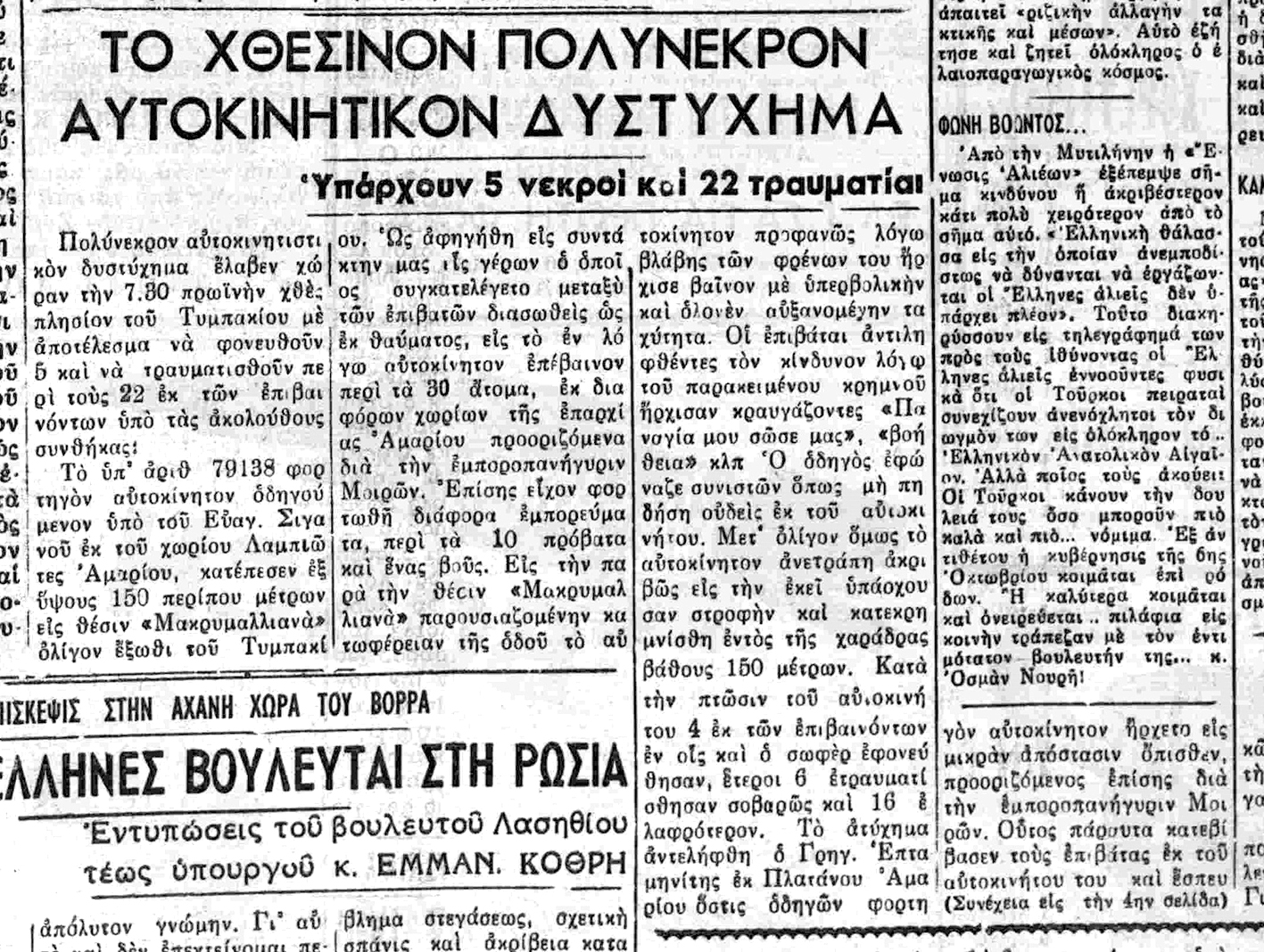 Το υπ αριθ 79138 φορτηγόν αυτοκίνητον οδηγούμενον υπό του Ευαγγ. Σιγανού εκ του χωρίου Λαμπιώτες Αμαρίου κατέπεσεν εξ ύψους 150 περίπου μέτρων εις θέσιν «Μακρυμαλλιανά» ολίγον έξωθι του Τυμπακίου. Ως αφηγήθη εις συντάκτην μας είς γέρων ο οποίος συγκαταλέγετο μεταξύ των επιβατών διασωθείς ως εκ θαύματος, εις το εν λόγω αυτοκίνητον επέβαινον περί τα 30 άτομα, εκ διαφόρων χωρίων της επαρχίας Αμαρίου προοριζόμενα δια την εμποροπανήγυριν Μοιρών. Επίσης είχον φορτωθή διάφορα εμπορεύματα, περί τα 10 πρόβατα και ένας βούς. Εις την παρά την θέσιν «Μακρυμαλλιανά» παρουσιαζομένην κατωφέρειαν της οδού το αυτοκίνητον προφανώς λόγω βλάβης των φρένων του ήρχισε βαίνον με υπερβολικήν και ολονέν αυξανομένην ταχύτητα. Οι επιβάται αντιληφθέντες τον κίνδυνο λόγω του παρακειμένου κρημνού ήρχισαν κραυγάζοντες «Παναγία μου σώσε μας», «βοήθεια» κλπ. Ο οδηγός εφώναζεν συνιστών όπως μη πηδήση ουδείς εκ του αυτοκινήτου. Μετ’ ολίγον όμως το αυτοκίνητον ανετράπη ακριβώς εις την εκεί υπάρχουσαν στροφήν και κατεκρημνίσθη εντός της χαράδρας βάθους 150 μέτρων. Κατά την πτώσιν του αυτοκινήτου 4 εκ των επιβαινόντων εν οις και ο σωφέρ εφονεύθησαν, έταιροι 6 ετραυματίσθησαν σοβαρώς και 16 ελαφρότερον. Το ατύχημα αντελήφθη ο Γρηγ. Επταμηνίτης εκ Πλατάνου Αμαρίου, όστις οδηγών φορτηγόν αυτοκίνητον ήρχετο εις μικράν απόστασιν όπισθεν προοριζόμενος επίσης δια την εμποροπανήγυριν Μοιρών. Ούτος πάραυτα κατεβίβασεν τους επιβάτας εκ του αυτοκινήτου του και έσπευ(συνέχεια εις την 4ην σελίδα)