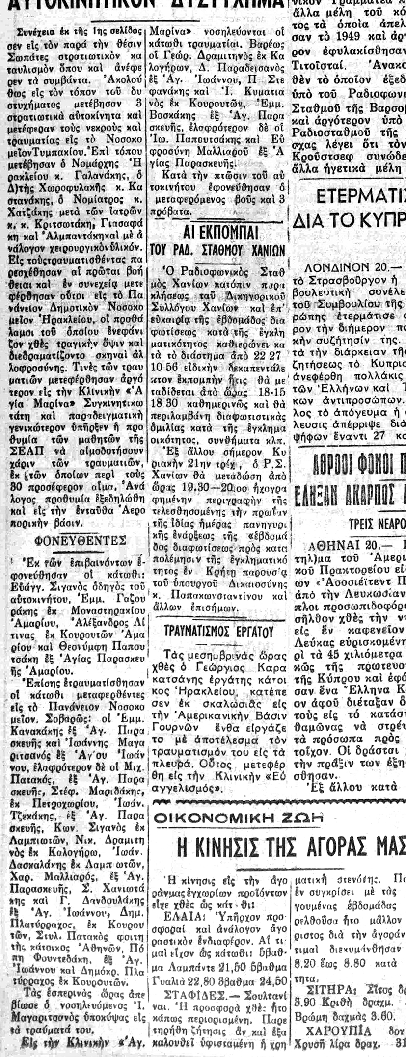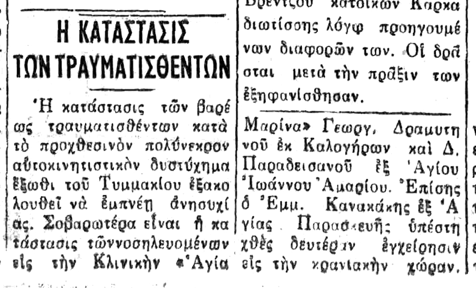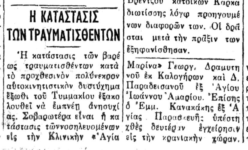 Η κατάστασις των βαρέως τραυματισθέντων κατά το προχθεσινόν πολύνεκρον αυτοκινητιστικόν δυστύχημα έξωθεν του Τυμπακίου εξακολουθεί να εμπνέει ανησυχίας. Σοβαρωτέρα είναι η κατάστασις των νοσηλευομένων εις την κλινικήν «Αγία Μαρίνα» Γεωργ. Δραμυτηνού εκ Καλογήρων και Δ. Παραδεισανού εξ Αγίου Ιωάννου Αμαρίου. Επίσης ο Εμμ. Κανακάκης εξ Αγίας Παρασκευής υπέστη χθες δευτέραν εγχείρησιν εις την κρανιακήν χώραν.»